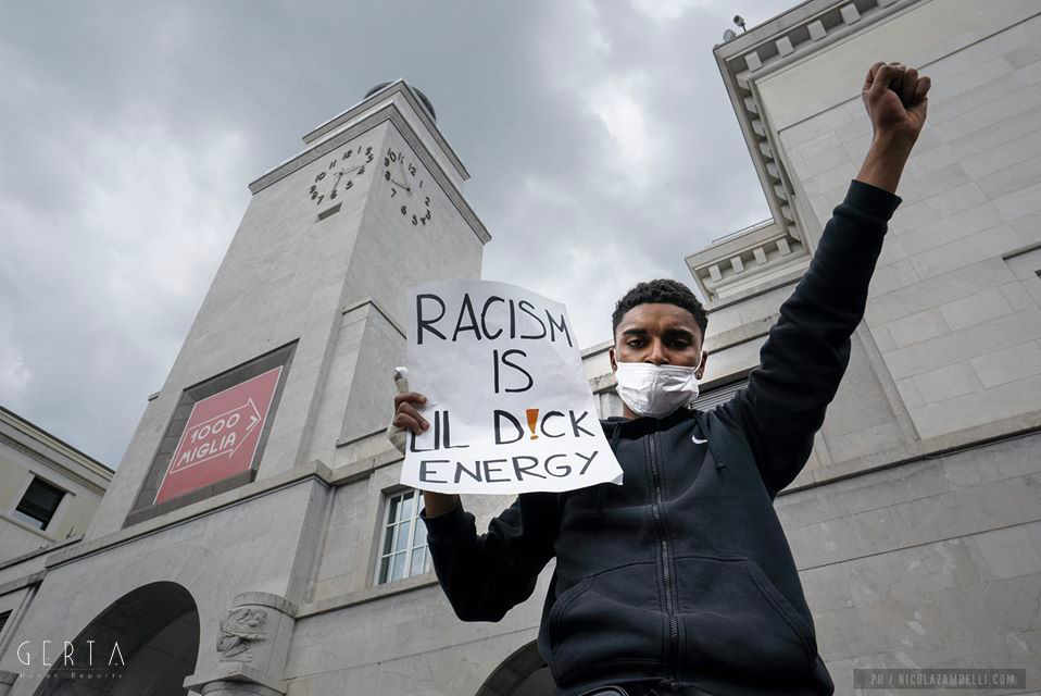 Tuttavia, martedì 9 giugno migliaia di persone si sono riversate nella prima, Piazza Vittoria, per un presidio antirazzista. In tremila circa hanno risposto all’appello lanciato dal Kollettivo Studenti in Lotta (espressione studentesca del Magazzino47, centro sociale cittadino) e dall’UDS, con l’adesione di numerose realtà sociali. Dalle 17 sono stati urlati slogan ed esposti cartelli e striscioni contro il razzismo sistemico e strutturale e le violenze della polizia. “Black Lives Matter” e “No justice No peace” le parole d’ordine più diffuse, che inquadrano la mobilitazione nel contesto globale di sollevazioni partito dagli Stati Uniti dopo l’omicidio di George Flyod da parte della polizia di Minneapolis. Anche a Brescia, come in migliaia di città nel mondo, la rabbia per le forme contemporanee di segregazione e le violenze istituzionali ha prevalso sulla paura del contagio, senza tuttavia oscurare la necessità di proteggersi da quest’ultimo. Mascherine (molto diffuse e “personalizzate”) e distanziamento fisico non hanno tuttavia impedito che la piazza si popolasse fin da subito e si inginocchiasse in silenzio, con il pugno alzato, per ricordare George Floyd e tutte le vittime (numerose, purtroppo, anche in Italia) del razzismo più o meno istituzionale e delle violenze poliziesche.