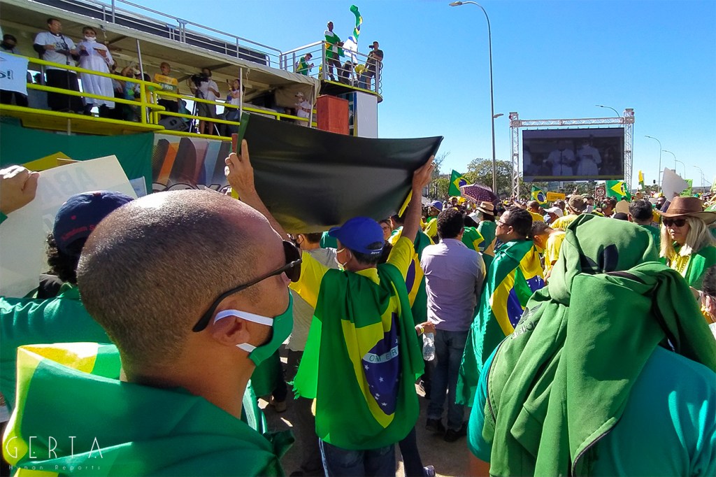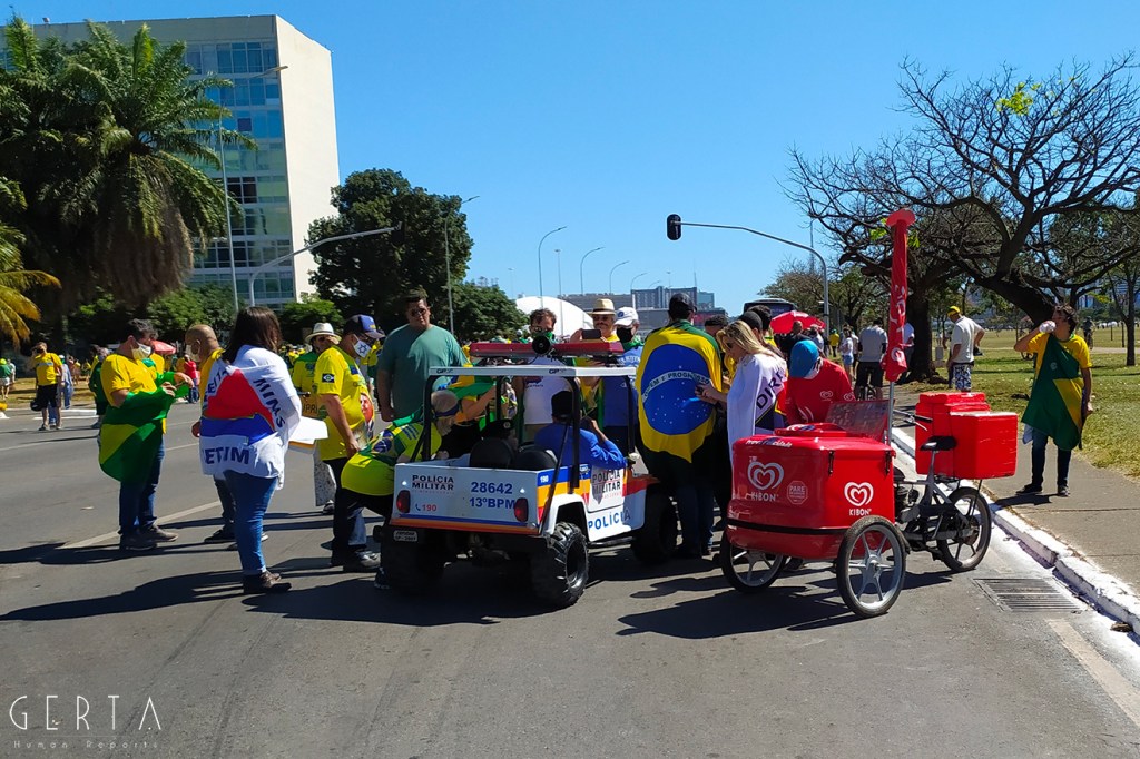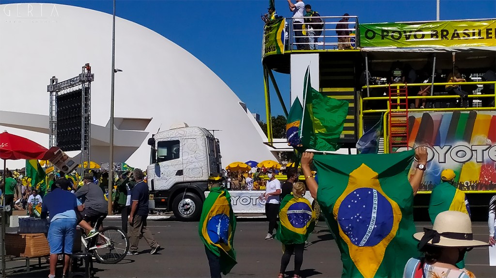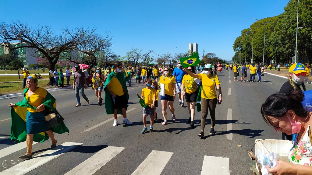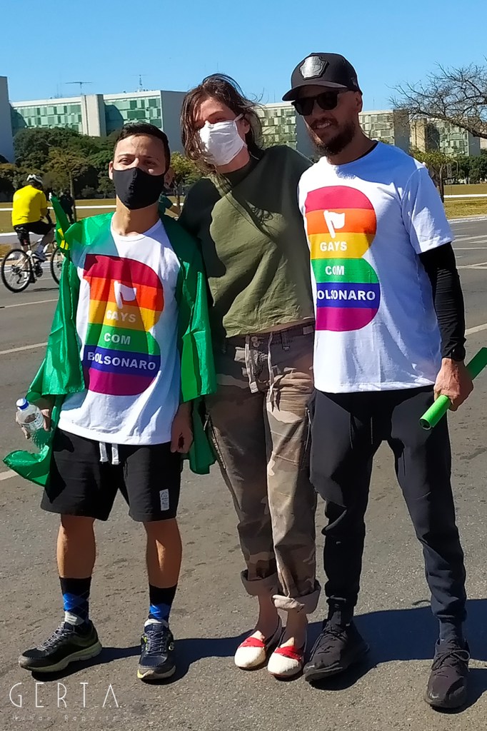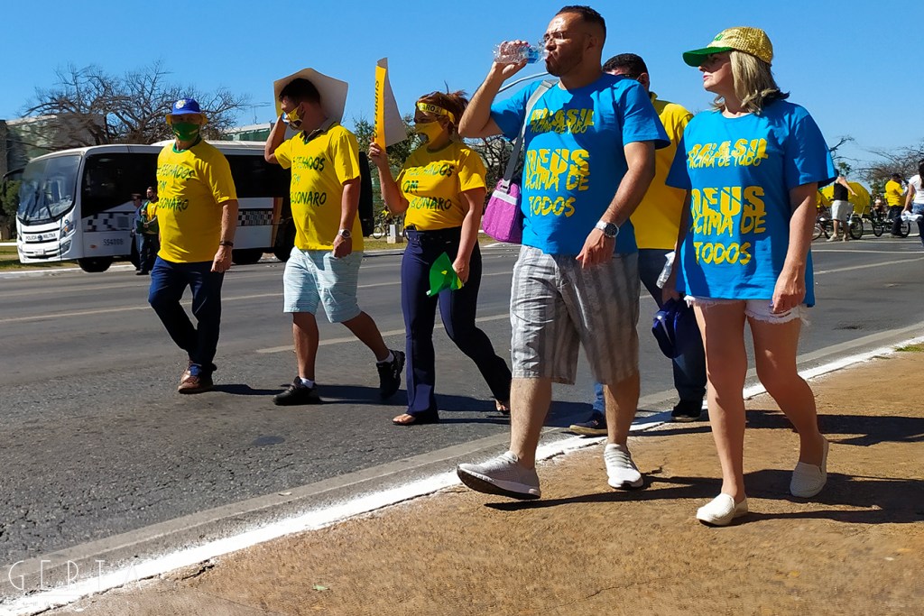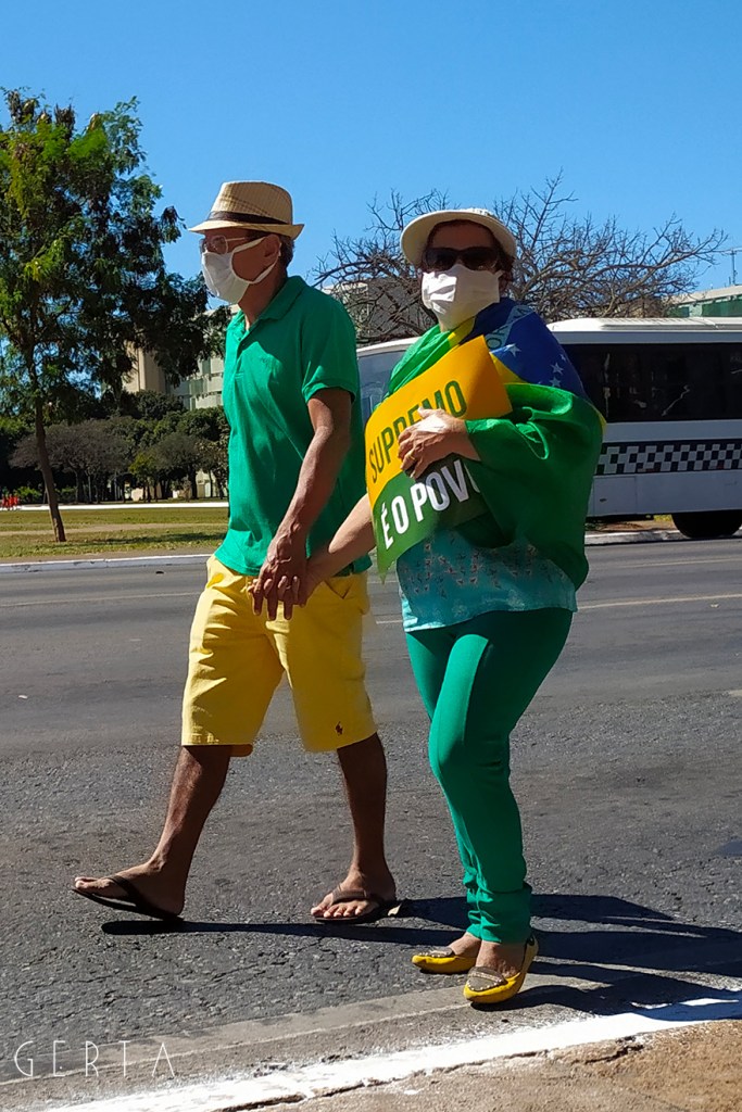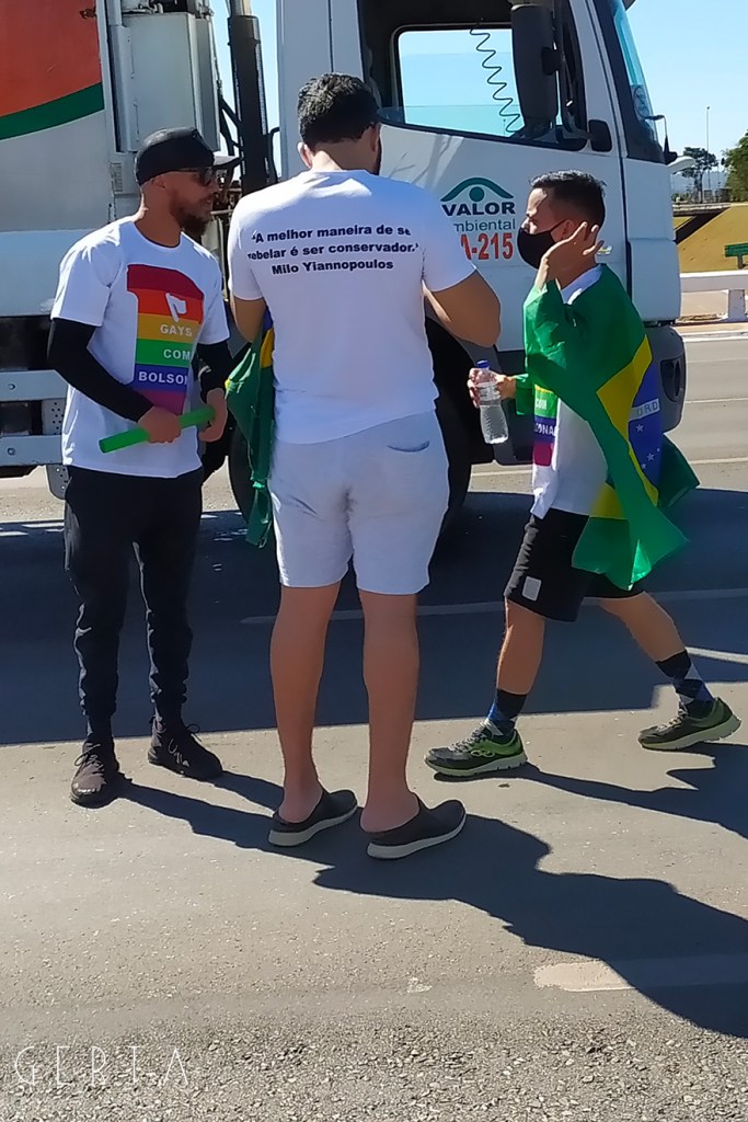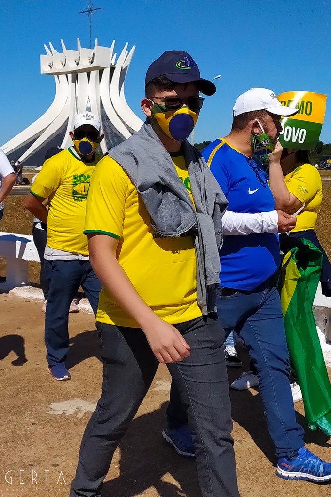La manifestazione a favore del governo invece aveva la solita aria di scampagnata condita da invocazioni a dio contro i nemici del Brasile e del suo presidente. Tipicamente i partecipanti erano vestiti con i colori del Brasile, le magliette e le mascherine pro-Bolsonaro. Numerose le persone senza maschera ed il distanziamento non sempre rispettato. Assembramenti significativi si sono visti attorno al palco mobile da dove hanno parlato esponenti della destra religiosa (cattolica ed evangelica) e dell’ala miliziana del bolsonarismo, entrambi uniti nell’invocazione dell’intervento dell’esercito contro il parlamento ed il STF. Altri assembramenti attorno ai carrettini che arrostivano carne all’aperto contribuivano a dare a tutta la situazione l’aria di una scampagnata organizzata dall’Opus Dei. Numerose le persone di colore e persino un gruppetto di “Gay per Bolsonaro”.