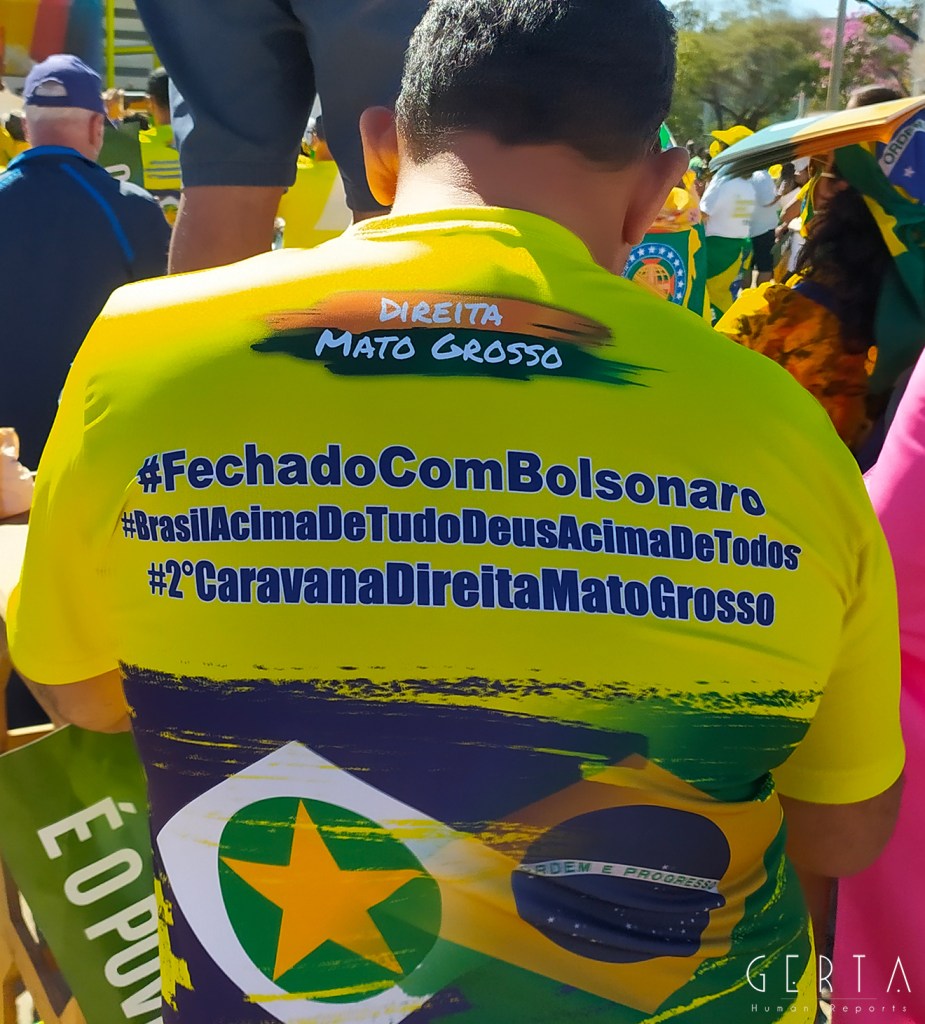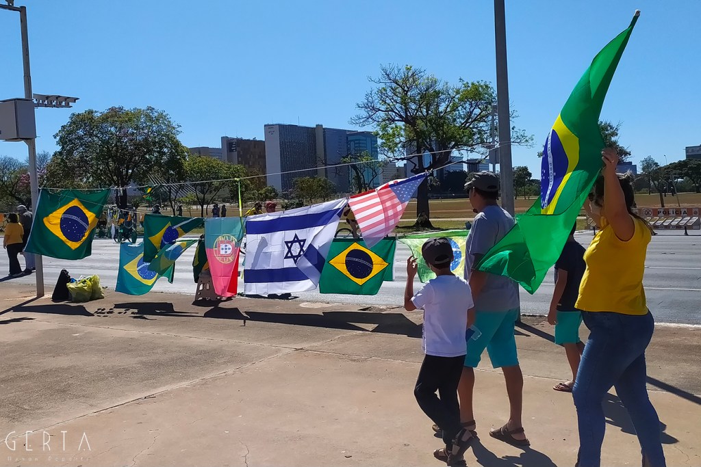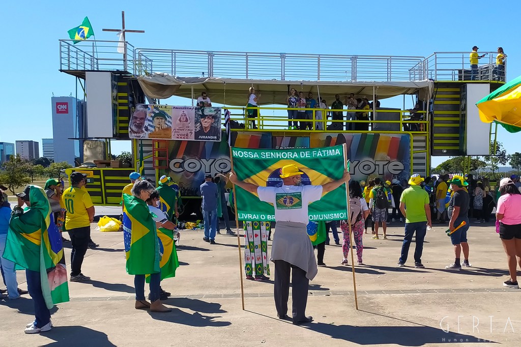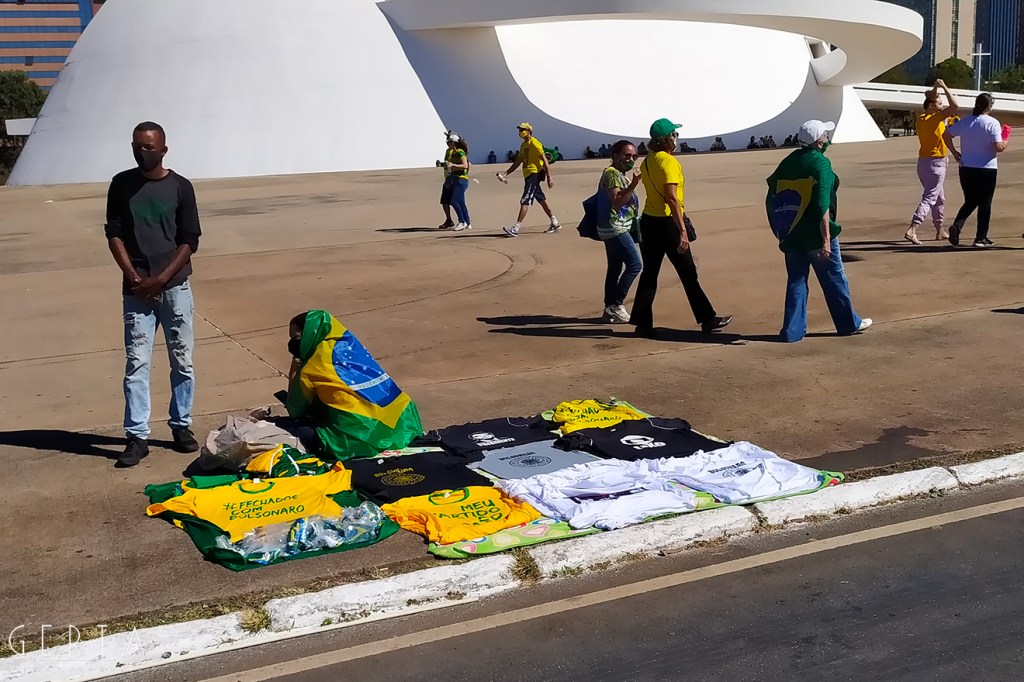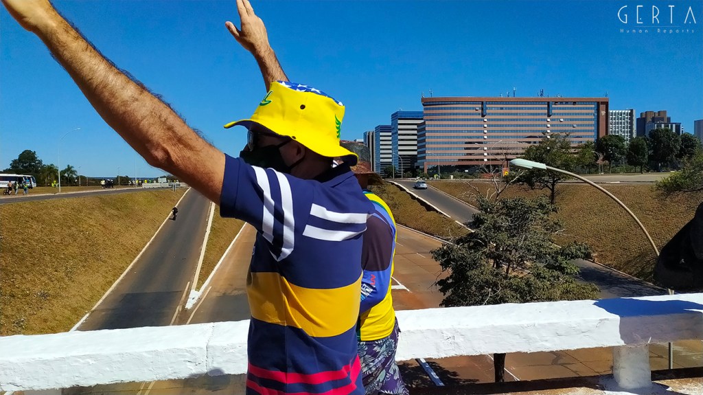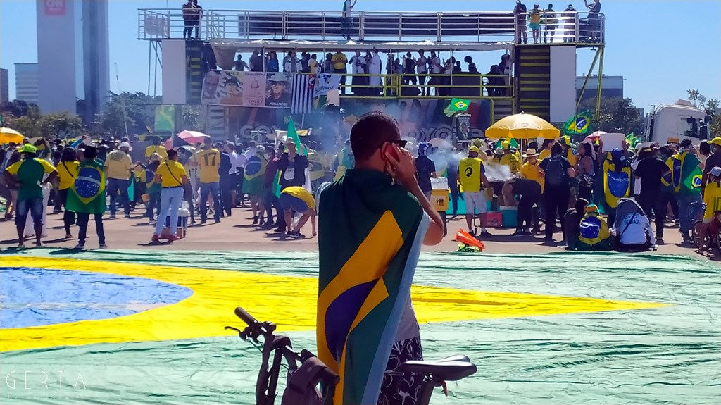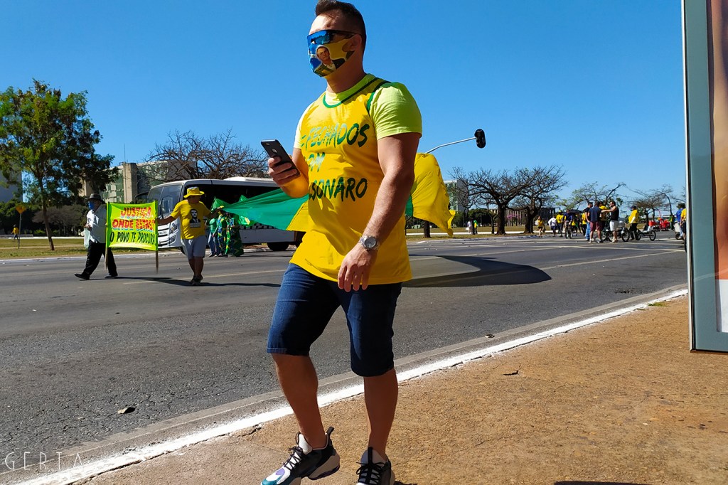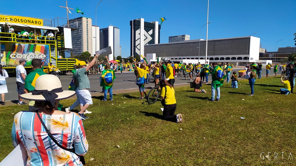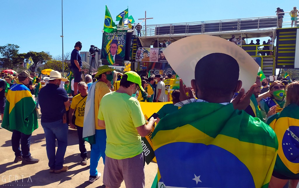 La manifestazione a favore del governo invece aveva la solita aria di scampagnata condita da invocazioni a dio contro i nemici del Brasile e del suo presidente. Tipicamente i partecipanti erano vestiti con i colori del Brasile, le magliette e le mascherine pro-Bolsonaro. Numerose le persone senza maschera ed il distanziamento non sempre rispettato. Assembramenti significativi si sono visti attorno al palco mobile da dove hanno parlato esponenti della destra religiosa (cattolica ed evangelica) e dell’ala miliziana del bolsonarismo, entrambi uniti nell’invocazione dell’intervento dell’esercito contro il parlamento ed il STF. Altri assembramenti attorno ai carrettini che arrostivano carne all’aperto contribuivano a dare a tutta la situazione l’aria di una scampagnata organizzata dall’Opus Dei. Numerose le persone di colore e persino un gruppetto di “Gay per Bolsonaro”.