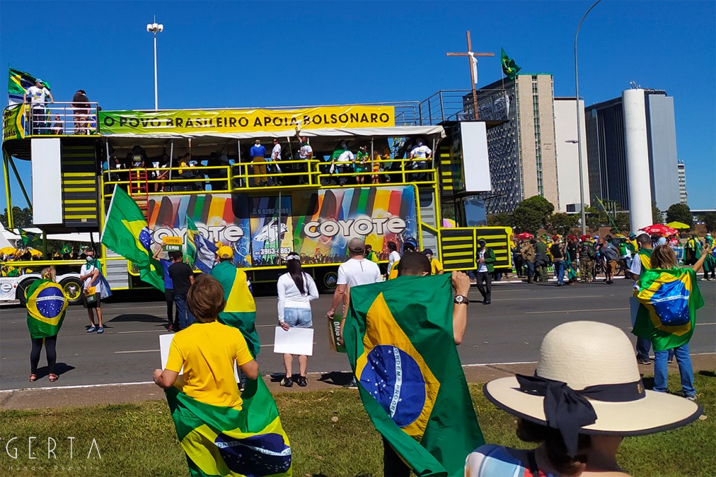 Dall’inizio di marzo, quando iniziavano in Brasile le prime misure di lockdown, i sostenitori di Bolsonaro, contravvenendo alle indicazioni dei governatori e dello stesso Ministero della Salute, si sono regolarmente riuniti tutte le domeniche di fronte al palazzo di Planalto, sede della presidenza della repubblica federale. In quelle occasioni, Bolsonaro si presentava di fronte ai suoi sostenitori, assiepati dietro le transenne, senza maschera, abbracciando bambini e scattando selfies. Alcune volte, dopo queste apparizioni, si è recato in vari luoghi di Brasilia causando assembramenti e criticando le misure di isolamento sociale (disposte dai governatori dei vari stati). In verità, i sostenitori del presidente non hanno mai superato le poche centinaia di manifestanti, ma tra essi numerosi erano quelli che invocavano misure antidemocratiche come l’intervento dell’esercito contro il parlamento e contro il Supremo Tribunale Federale (STF), una specie di nostra corte costituzionale con funzioni di cassazione, entrambi colpevoli secondo i Bolsonaristi di avversare i progetti del presidente della repubblica.