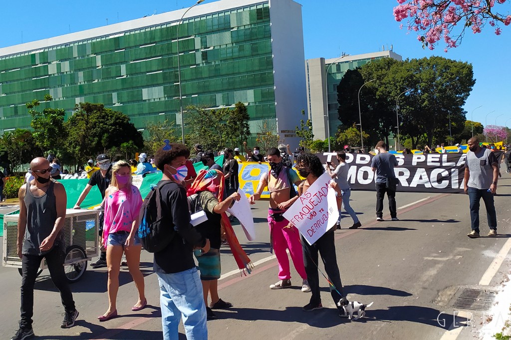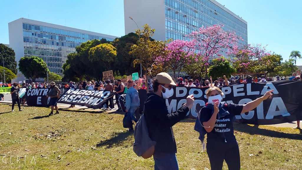Dunque, da marzo fino all’inizio di giugno, anche a causa della pandemia che faceva desistere i partiti di opposizione al governo da qualunque manifestazione pubblica, il monopolio delle piazze era stato conquistato dai Bolsonaristi, anche con il fine di contrastare esplicitamente le misure di isolamento sociale imposte dai governatori degli stati. Ad inizio di giugno si cominciano ad intravedere le prime misure di allentamento dell’isolamento da parte dei governatori. A questo punto, un movimento formato da tutte le forze democratiche comincia ad aggregarsi attorno a manifesti anti-bolsonaristi firmati da un fronte ampio.
