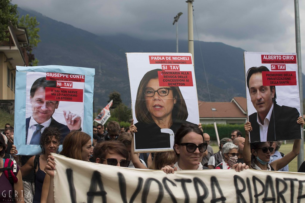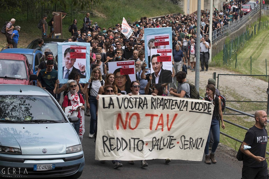 Ad accompagnarlo diversi cartelli raffiguranti quelli che per il movimento sono i responsabili della crisi economica che stiamo vivendo in conseguenza all’emergenza Covid-19, “che ha messo in luce le grandi problematiche che da anni attraversano il Paese: ingenti tagli alla sanità, distruzione dei diritti sul lavoro e sfruttamento dei territori. Conte, Cirio, De Micheli e Bonomi sono solo alcuni dei nomi di coloro che oggi, nonostante tutto, continuano a voler investire nelle grandi opere inutili a discapito di politiche e servizi a tutela di tutta la popolazione”, scrivono su notav.info.