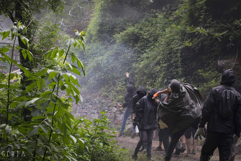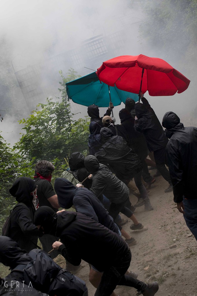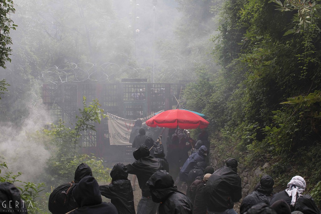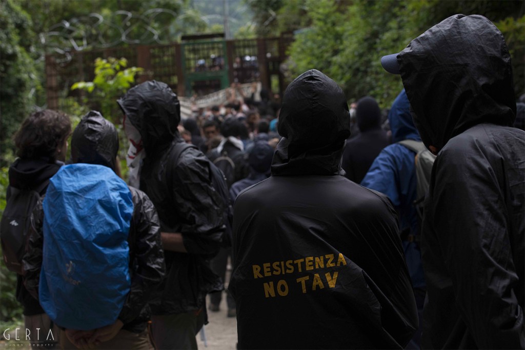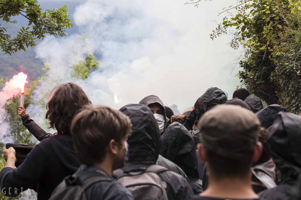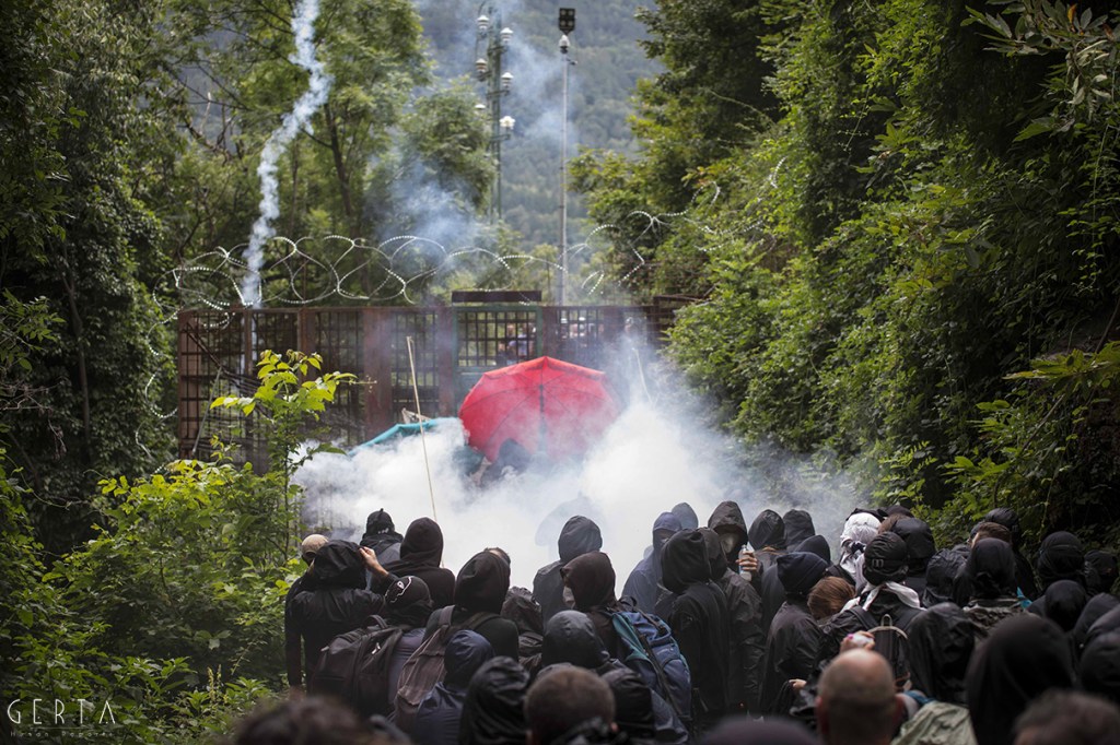 I manifestanti avanzano, coperti da k-way per difendersi dal getto degli idranti. Agganciano delle corde alla cancellata ed in gruppo iniziano a tirare. Altri cercano di tagliare qualche pezzo della struttura con un flessibile. Da dietro la struttura di ferro le forze dell’ordine iniziano un fitto lancio di lacrimogeni. Anche un altro gruppo di agenti appostati più in alto suldestro del sentiero, nascosti tra la vegetazione inizia a sparare i proiettili di gas CS in loro dotazione. L’aria si satura rapidamente di gas e diventa irrespirabile. I NoTav cercano con due ombrelloni di proteggere dal lancio il gruppo che tira le corde. Sempre dal lato destro cade dall’alto quella che sembra essere una granata stordente ed esplode in mezzo al gruppo. Inizia da parte dei manifestanti il lancio di pietre in direzione della provenienza dell’ordigno esploso. Il gruppo indietreggia, alcuni cercano di lenire agli effetti urticanti del gas spalmandosi sugli occhi una miscela di acqua e Malox, un altro gruppo gli da il cambio in prima linea.