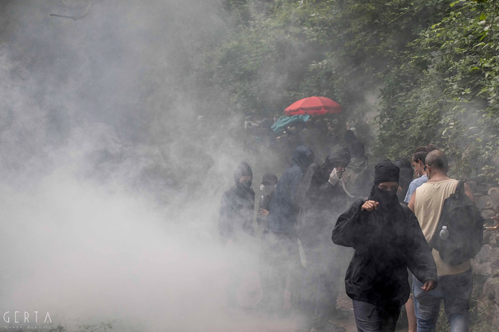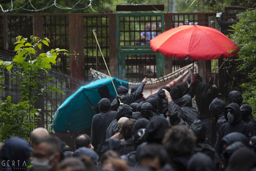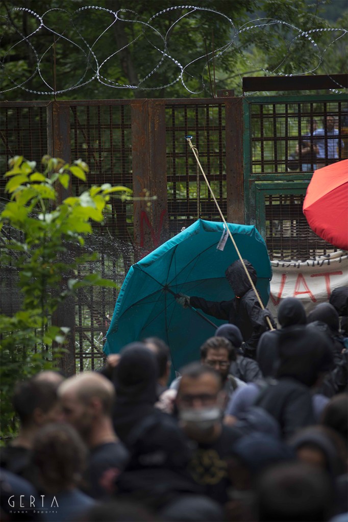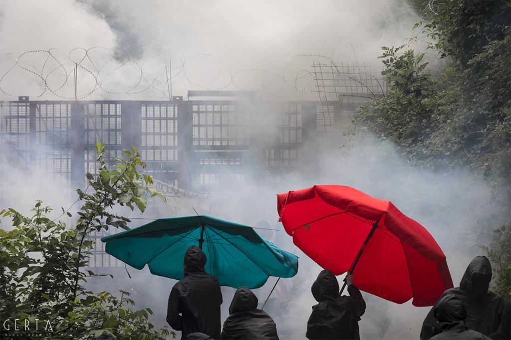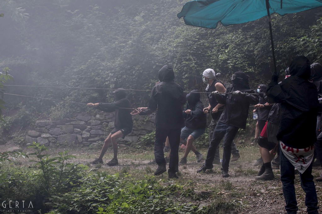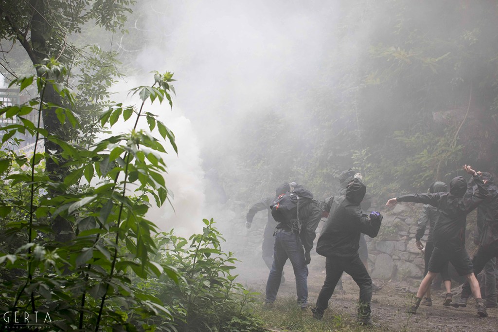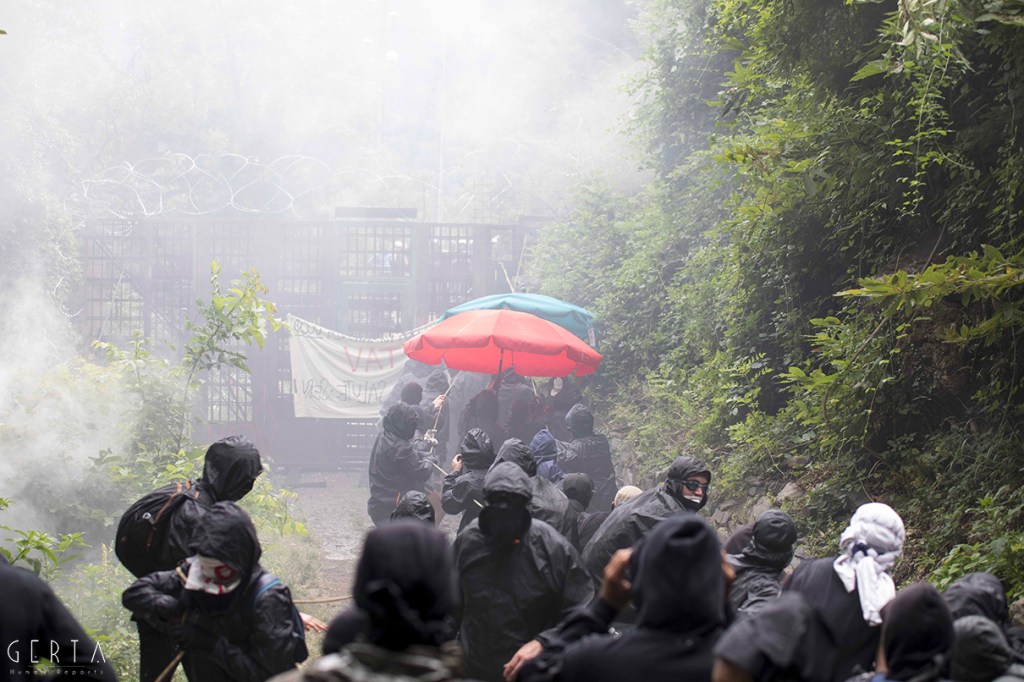 I manifestanti avanzano, coperti da k-way per difendersi dal getto degli idranti. Agganciano delle corde alla cancellata ed in gruppo iniziano a tirare. Altri cercano di tagliare qualche pezzo della struttura con un flessibile. Da dietro la struttura di ferro le forze dell’ordine iniziano un fitto lancio di lacrimogeni. Anche un altro gruppo di agenti appostati più in alto suldestro del sentiero, nascosti tra la vegetazione inizia a sparare i proiettili di gas CS in loro dotazione. L’aria si satura rapidamente di gas e diventa irrespirabile. I NoTav cercano con due ombrelloni di proteggere dal lancio il gruppo che tira le corde. Sempre dal lato destro cade dall’alto quella che sembra essere una granata stordente ed esplode in mezzo al gruppo. Inizia da parte dei manifestanti il lancio di pietre in direzione della provenienza dell’ordigno esploso. Il gruppo indietreggia, alcuni cercano di lenire agli effetti urticanti del gas spalmandosi sugli occhi una miscela di acqua e Malox, un altro gruppo gli da il cambio in prima linea.