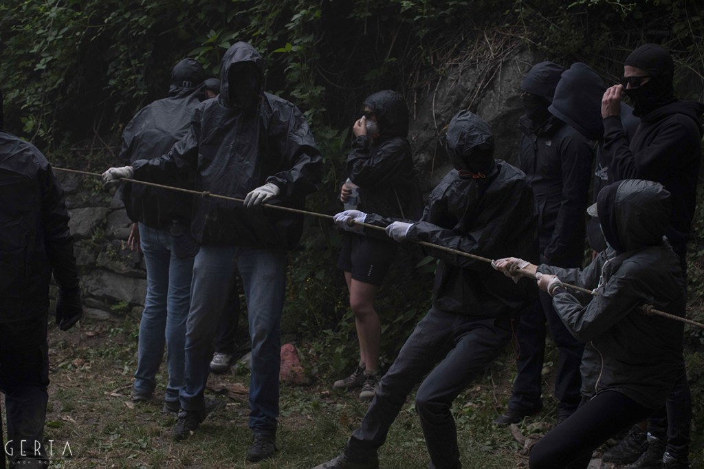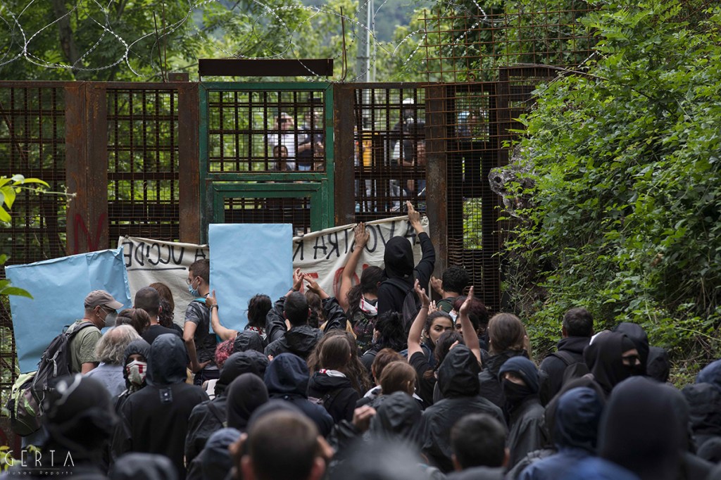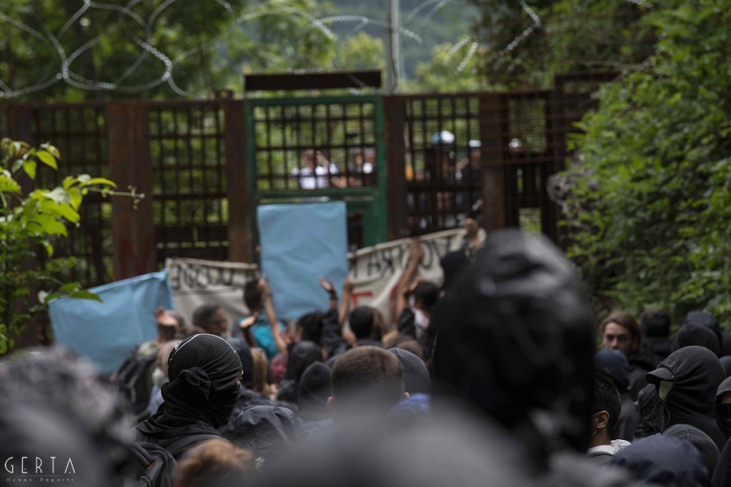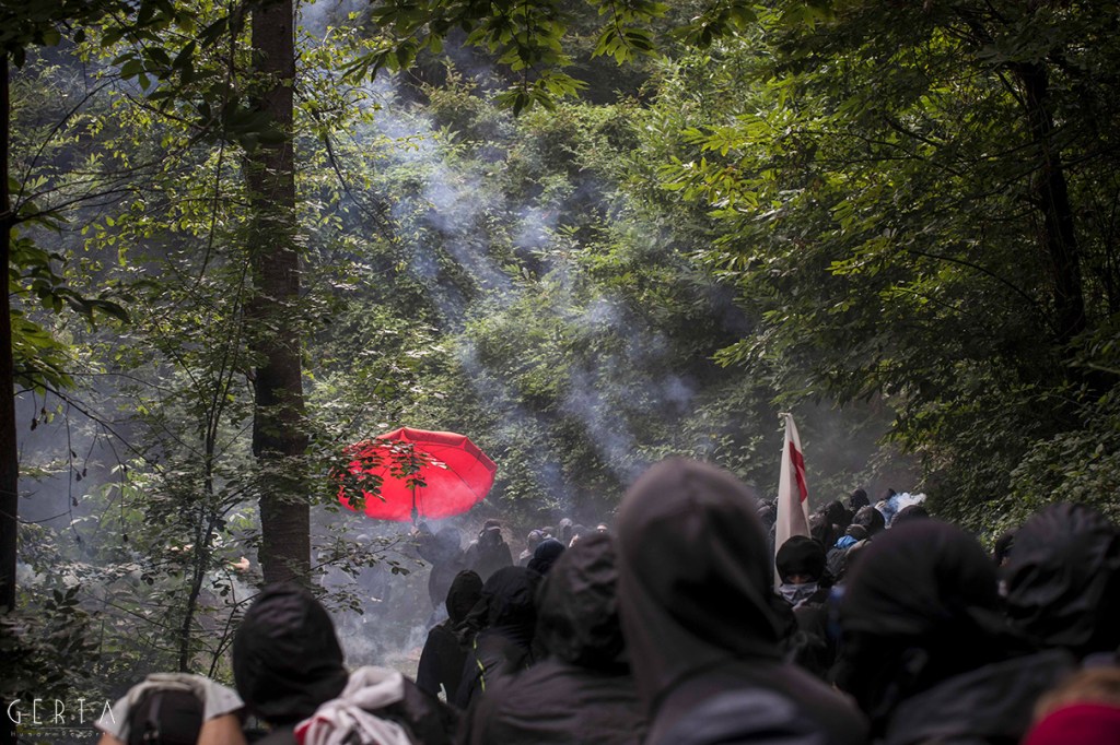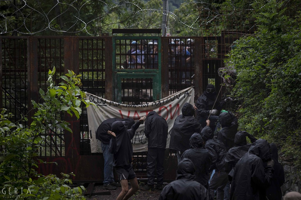 Dopo alcune curve del sentiero appare in tutta la sua pesantezza, innaturale come un intruso tra gli alberi del bosco, la cancellata di sbarramento. Dietro di essa le forze dell’ordine schierate iniziano ad infilarsi caschi e maschere antigas.