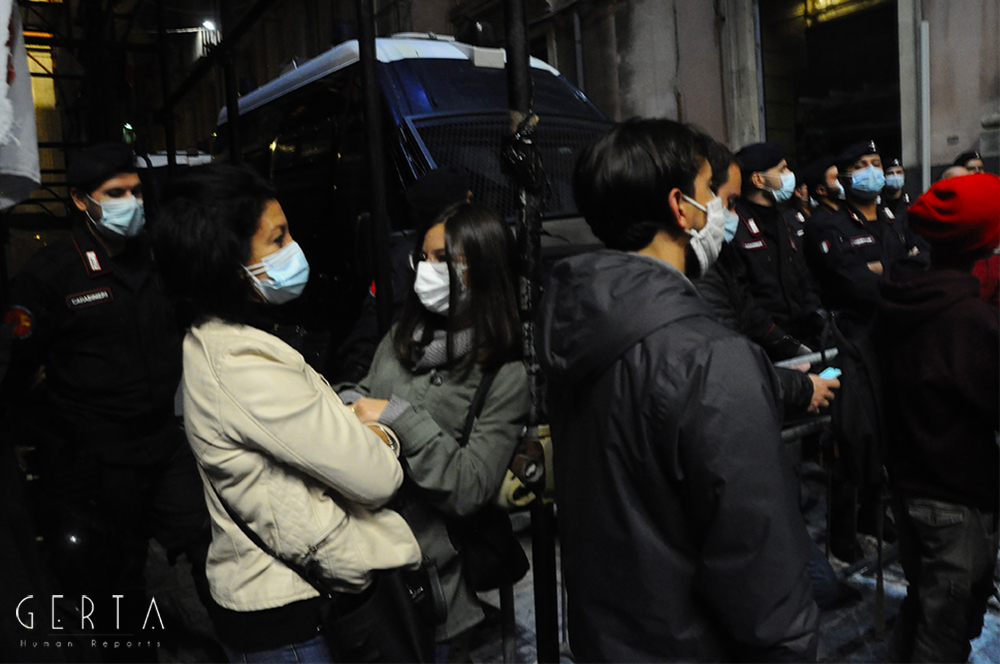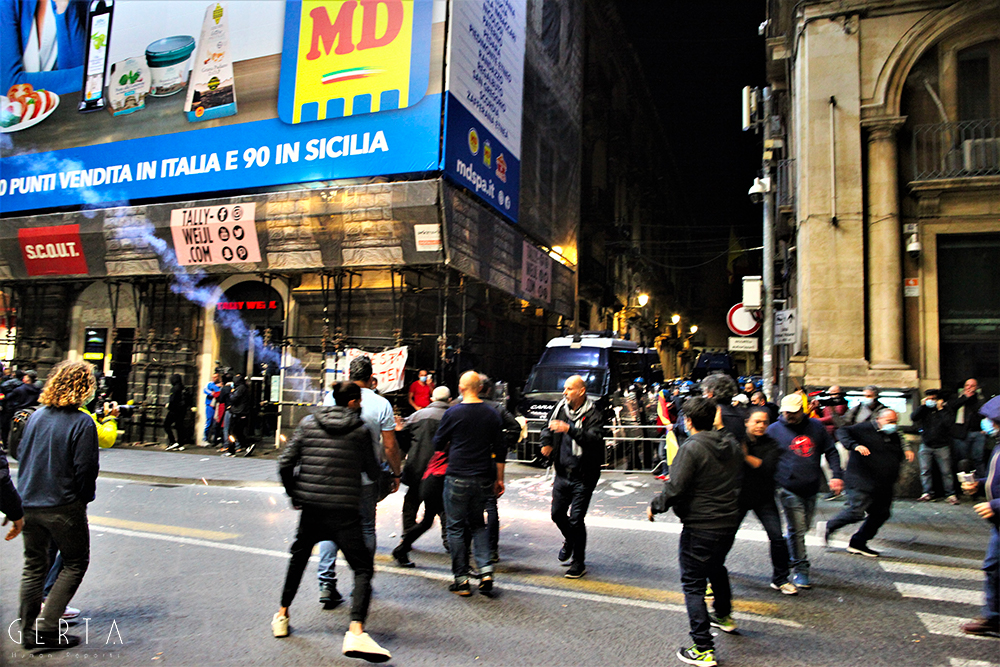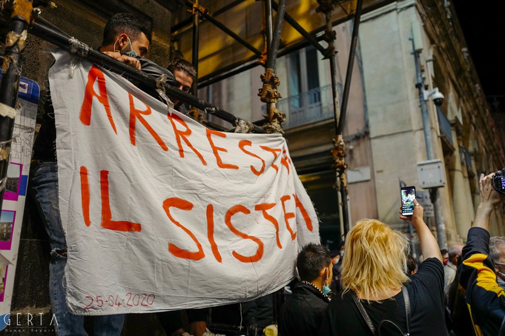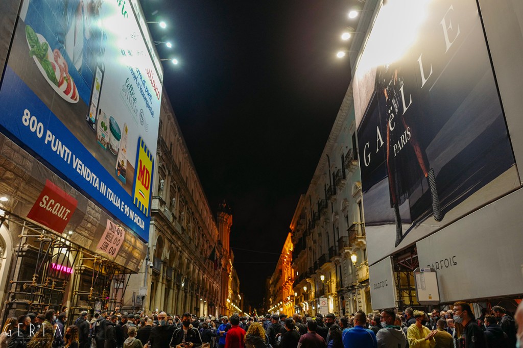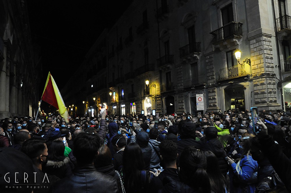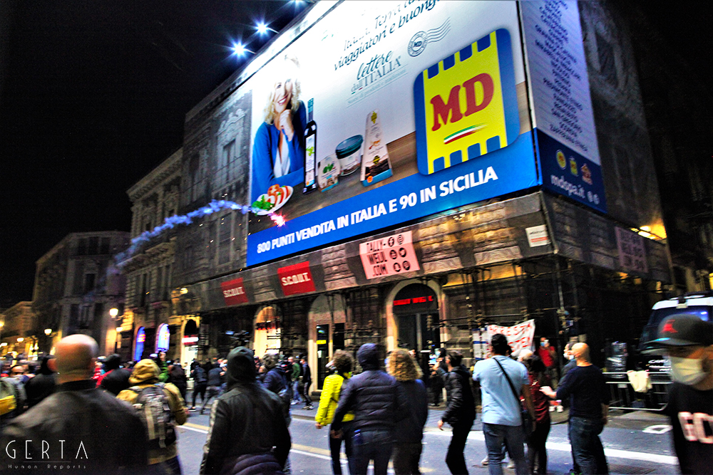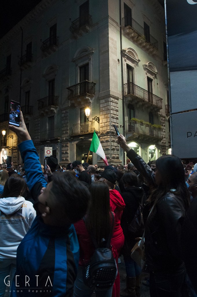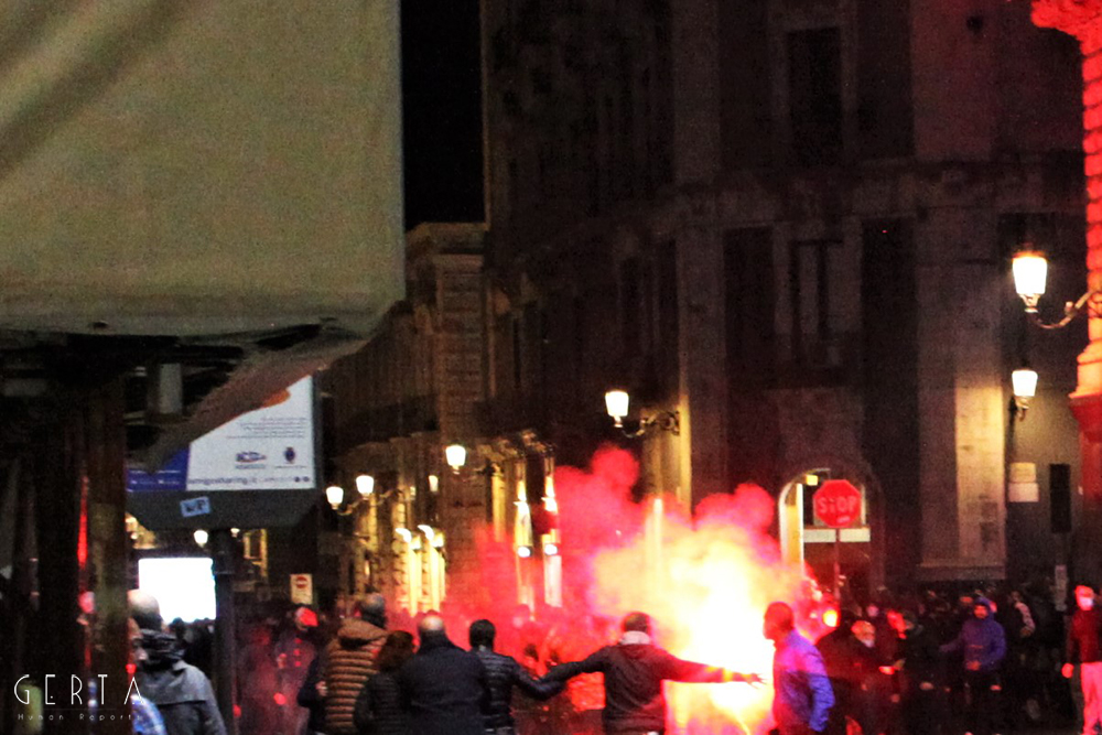 Innanzitutto una domanda sorge spontanea sul meccanismo di sicurezza messo in campo dalla questura: erano previsti due appuntamenti distinti, uno sotto la prefettura indetto dalle categorie produttive messe in ginocchio dalla pandemia e di nuovo duramente colpite dall’ultimo decreto emanato dal governo; l’altro in piazza Duomo dei neofascisti. Mentre nel primo caso non c’era ragionevolmente da aspettarsi alcun problema, nel secondo era invece semplice buonsenso tenere alta la guardia, vista la partecipazione dell’estrema destra insieme ad esponenti del mondo ultrà e soggetti legati alla criminalità organizzata, come successo a Napoli. Tenuto conto della serata precedente a Roma, dove i neofascisti erano riusciti a scorazzare per la città lanciando bombe carta e incendiando mezzi in sosta. Lo schieramento delle forze di polizia in piazza Duomo era costituito da uno sparuto manipolo di uomini del reparto mobile, a presidiare la prefettura una manciata di carabinieri trincerati dietro le transenne, tra la folla dei manifestanti sette-otto poliziotti in borghese. Qualche settimana fa in occasione della farsesca calata leghista a Catania per l’udienza preliminare al processo contro Salvini (per il sequestro di donne uomini e bambini sulla nave Gregoretti), la città era stata teatro di una militarizzazione senza precedenti: zone rosse interdette a chiunque, centinaia di uomini in assetto antisommossa, decine di blindati, elicotteri, addirittura container posizionati a difesa del porto dove si è svolta la convention leghista (quella nel corso della quale la Maraventano si è profusa in uno sperticato elogio alla mafia). Il tutto, con le dovute differenze, ricordava la Genova del sanguinario G8. Alla fine una colorata e festosa manifestazione si era conclusa senza il minimo problema: una simbolica “annacata” delle transenne e un lancio di rotoli di carta igienica con l’effige del “capitano”, tutto qui.