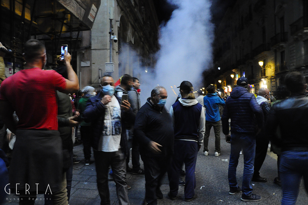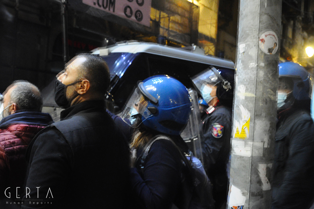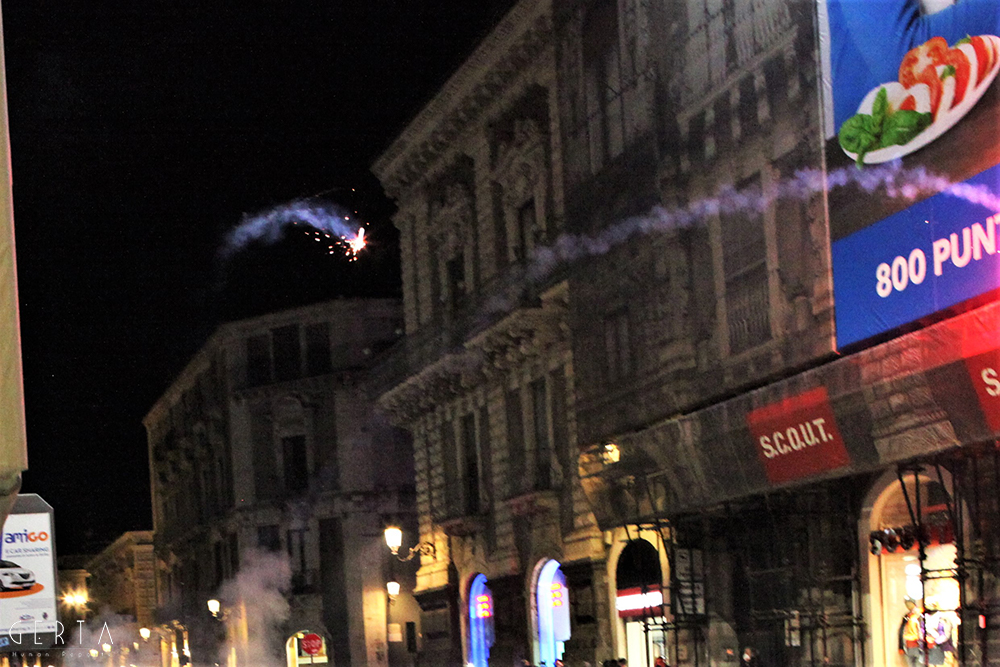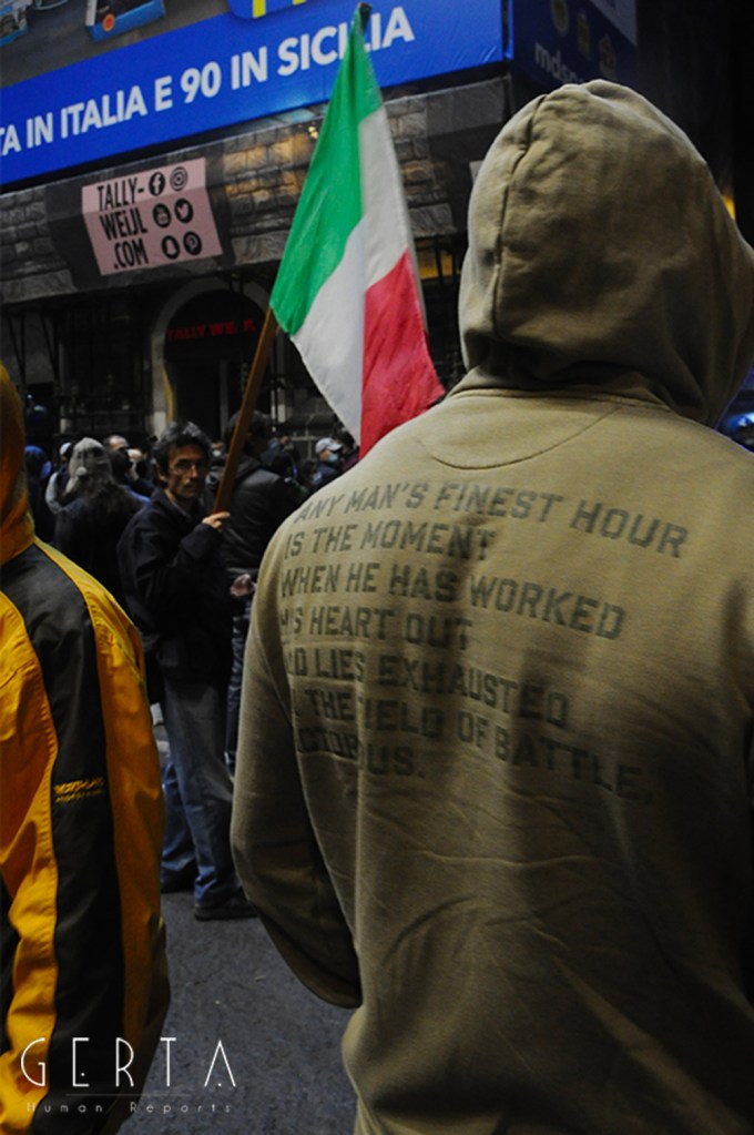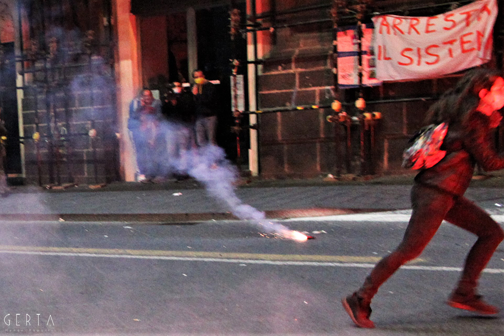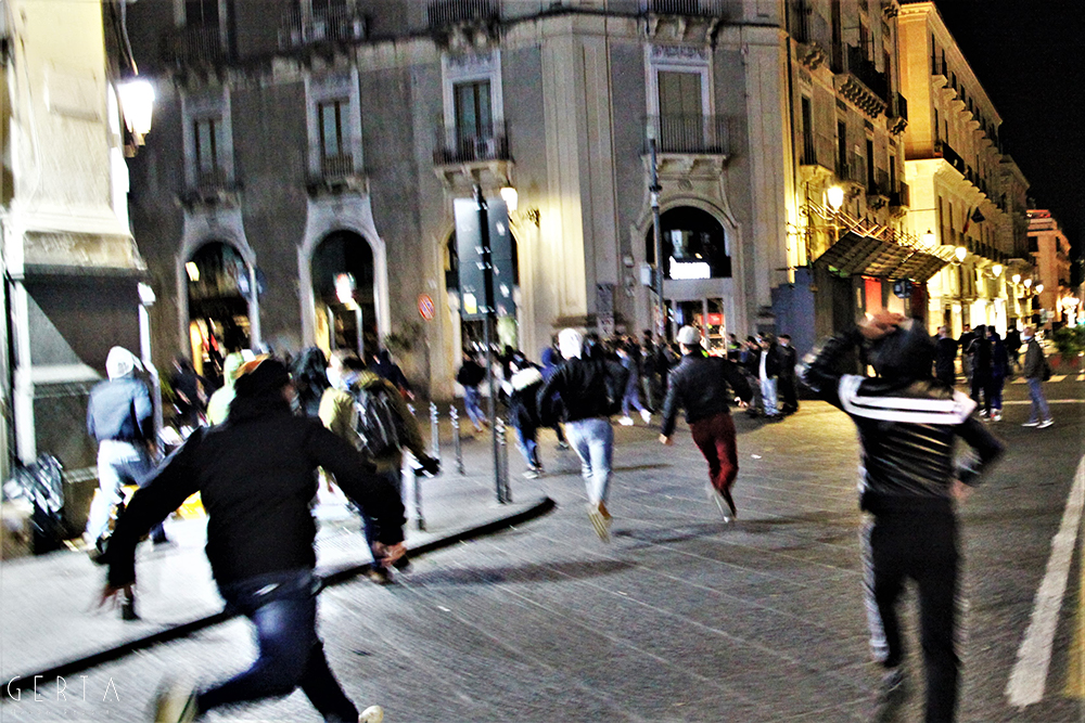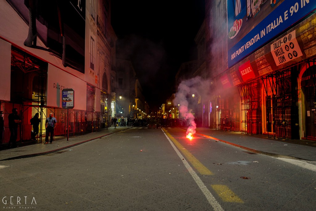 A questo punto i manifestanti pacifici hanno cominciato ad inveire contro il gruppo di provocatori, invitandoli ad allontanarsi. Lo schieramento di polizia, che nel frattempo era stato rafforzato con l’arrivo di agenti del reparto mobile, è rimasto fermo senza intervenire. Solo un gruppetto di poliziotti in borghese (sei o sette) si frapponeva tra i due schieramenti. I fascio/curvisti sono repentinamente indietreggiati, riposizionandosi all’incrocio dei quattro canti dove il gruppo si è infoltito con l’arrivo di altri soggetti, alcuni con i caschi, qualche spranga o cintura brandita a mo’ di arma. A fronteggiarli solo i pochi poliziotti in borghese, un ostacolo inconsistente, quasi simbolico. Il reparto della mobile ha continuato a rimanere fermo mentre dai provocatori è cominciato un lancio di bombe carta, bottiglie e fumogeni, bersaglio il presidio di manifestanti pacifici.
