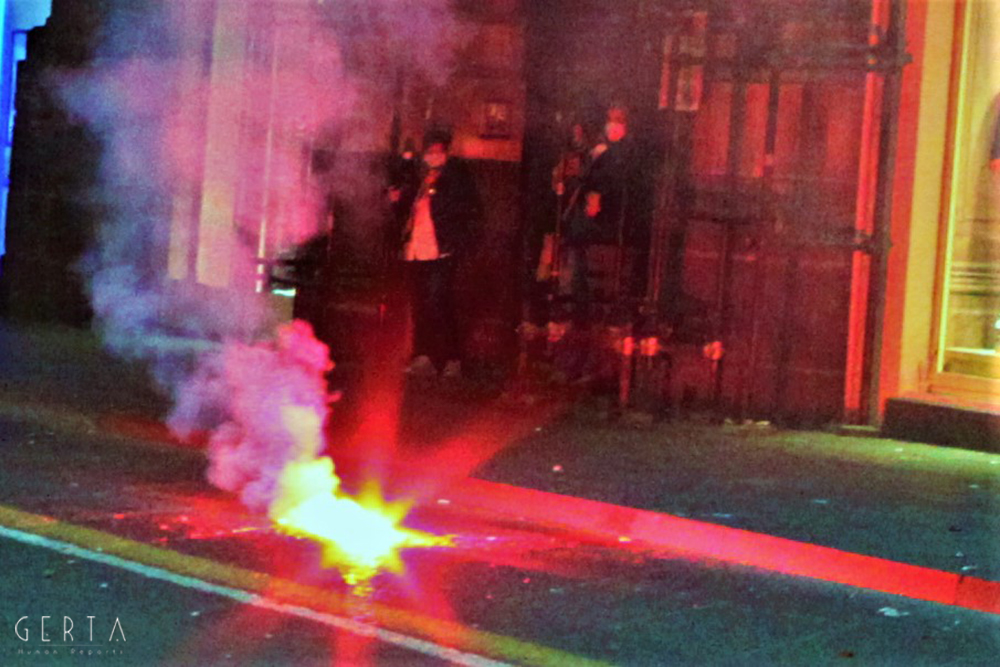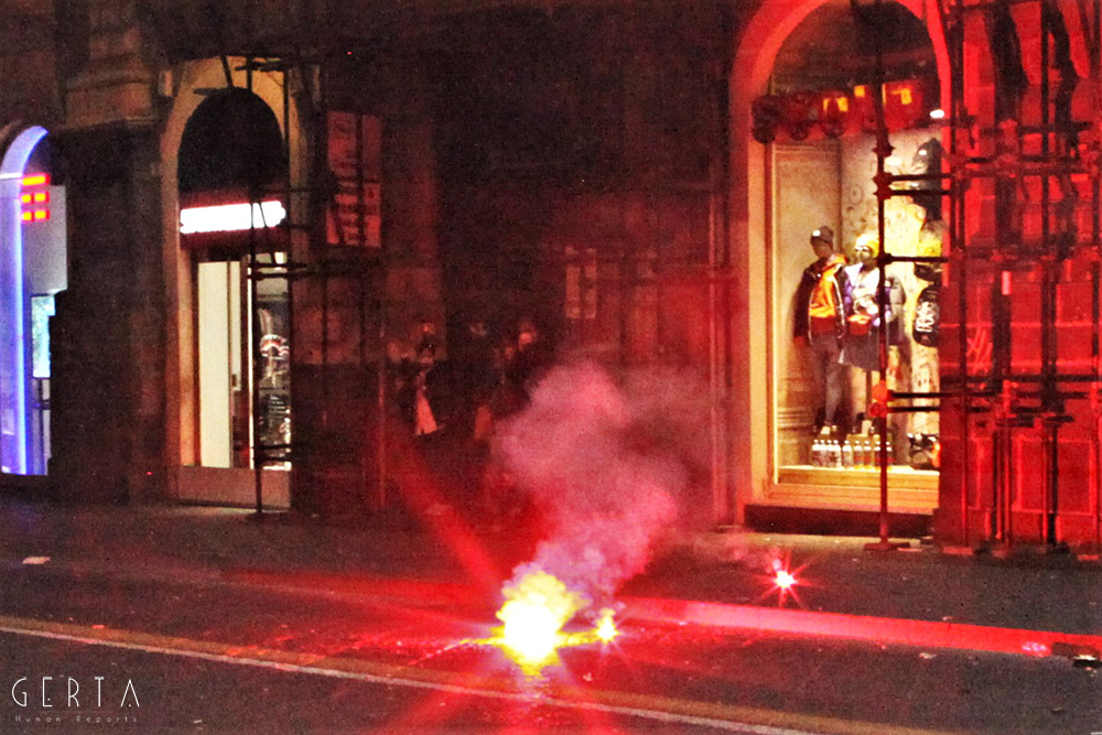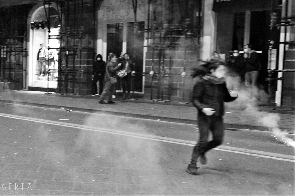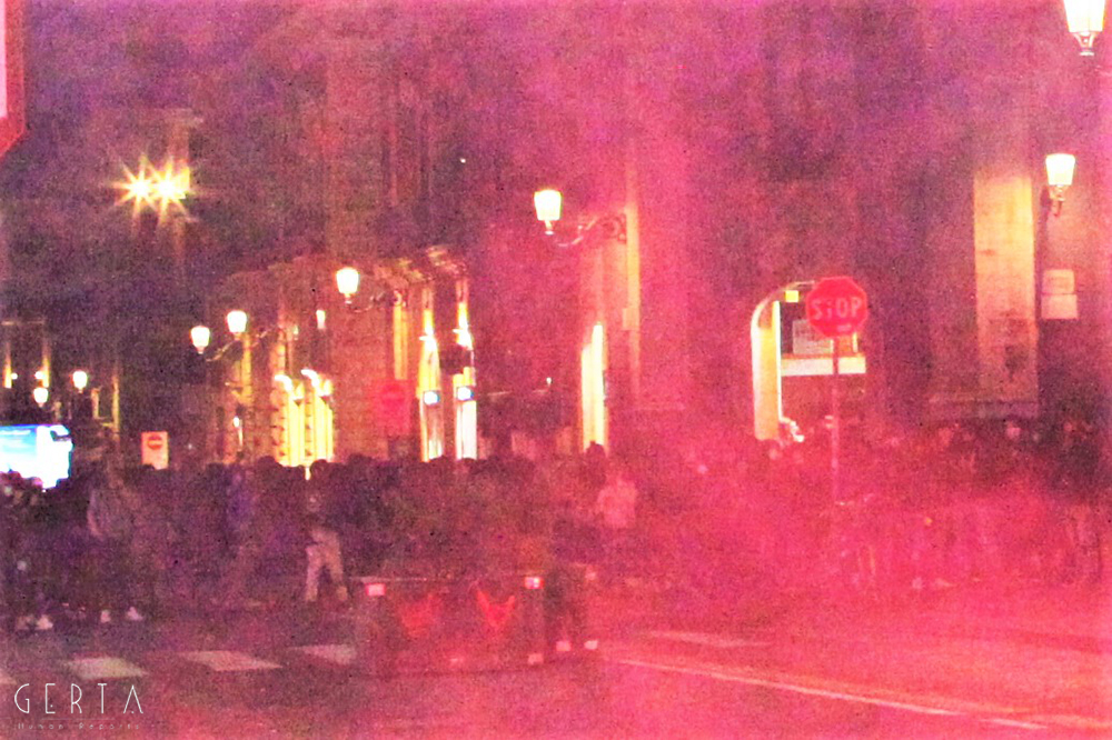 Il modo in cui si muovevano, decisi e spavaldi, ci ha indotto a seguirli, ci siamo posizionati in modo da avere una buona visuale e abbiamo aspettato. Abbiamo notato che i poliziotti in borghese presenti riprendevano e fotografavano proprio il gruppo che aveva attratto la nostra attenzione. Passata mezz’ora, improvvisamente una bomba carta, dopo aver tracciato l’aria con una breve parabola, è esplosa tra la folla: l’obbiettivo erano certamente i manifestanti. Il lancio è avvenuto da non più di sette metri, impossibile si sia trattato di un errore.