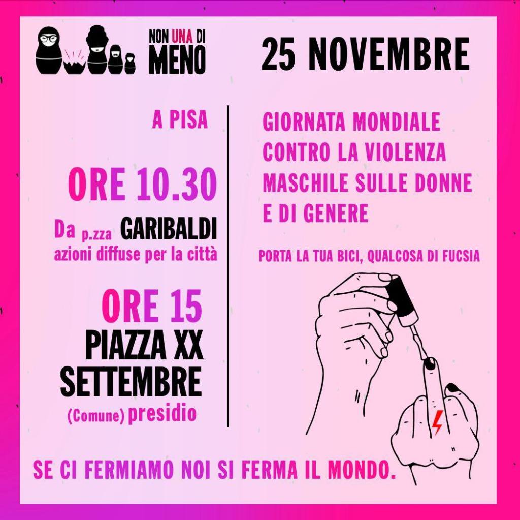Le donne di Pisa del movimento di Non Una di Meno non hanno accettato di restare chiuse in casa il 25 novembre, giornata mondiale contro la violenza sulle donne, hanno violato le restrizioni della zona rossa rischiando fermi e multe, hanno inforcato la bici e si sono dirette verso quei luoghi simbolo che istituzionalmente riproducono e perpetuano la violenza di genere e l’esclusione sociale.