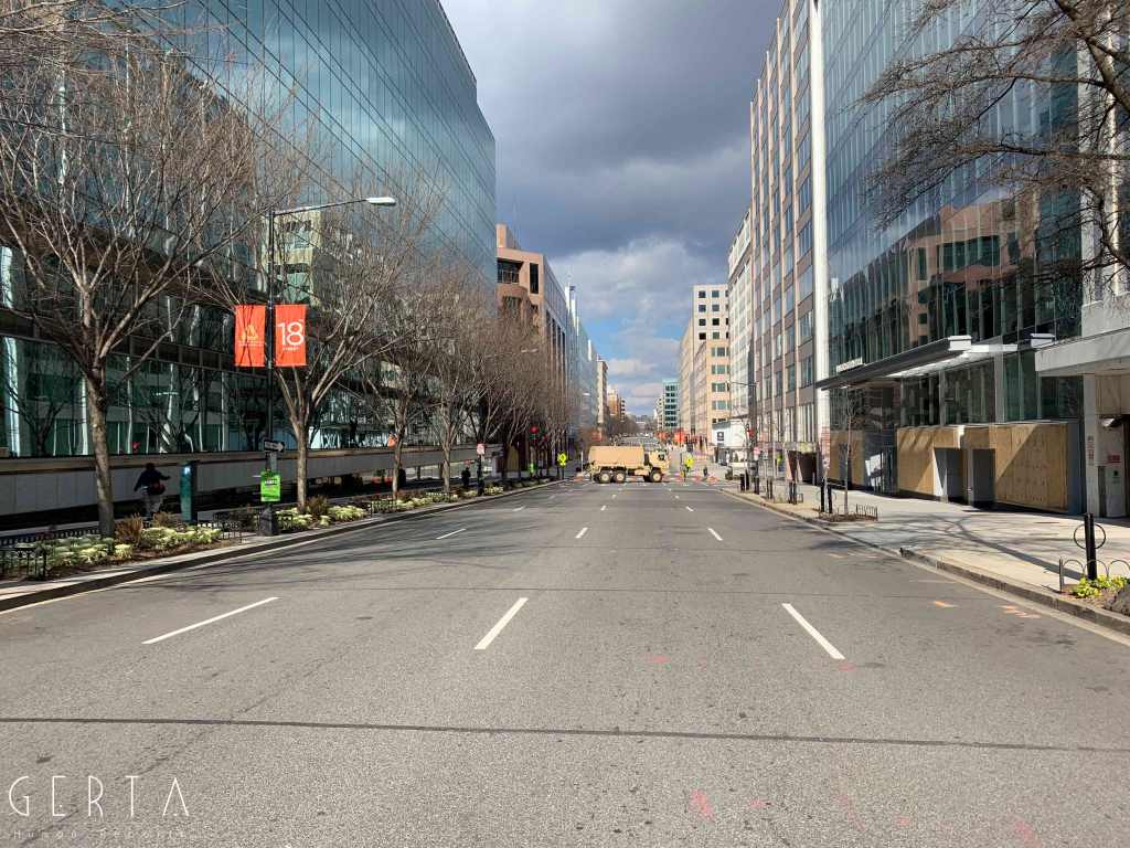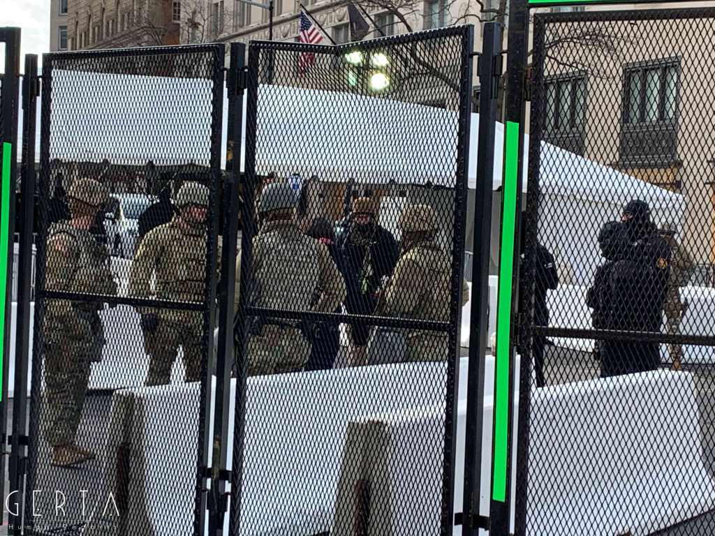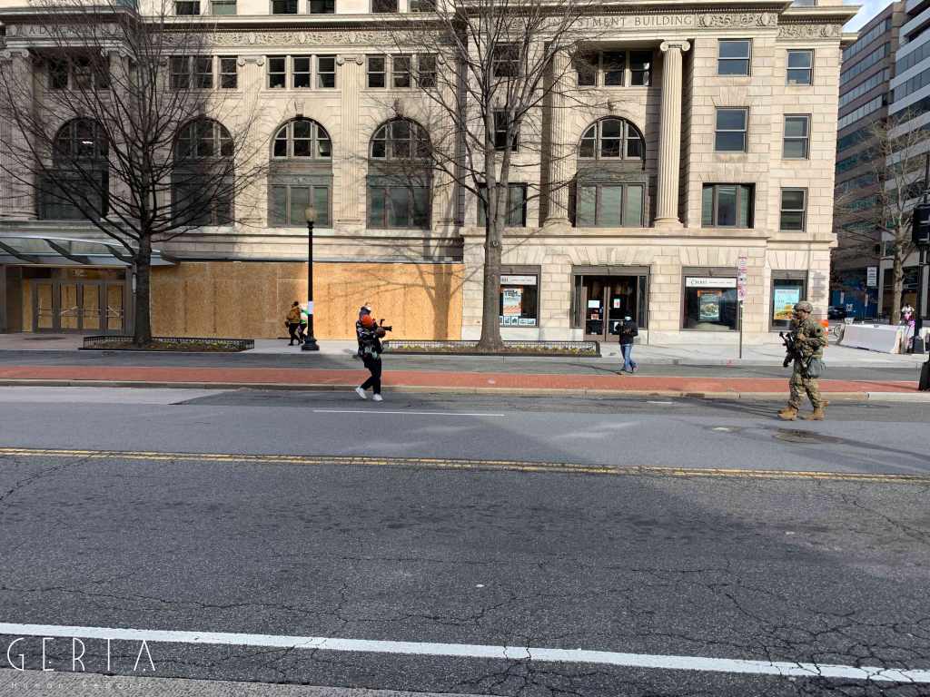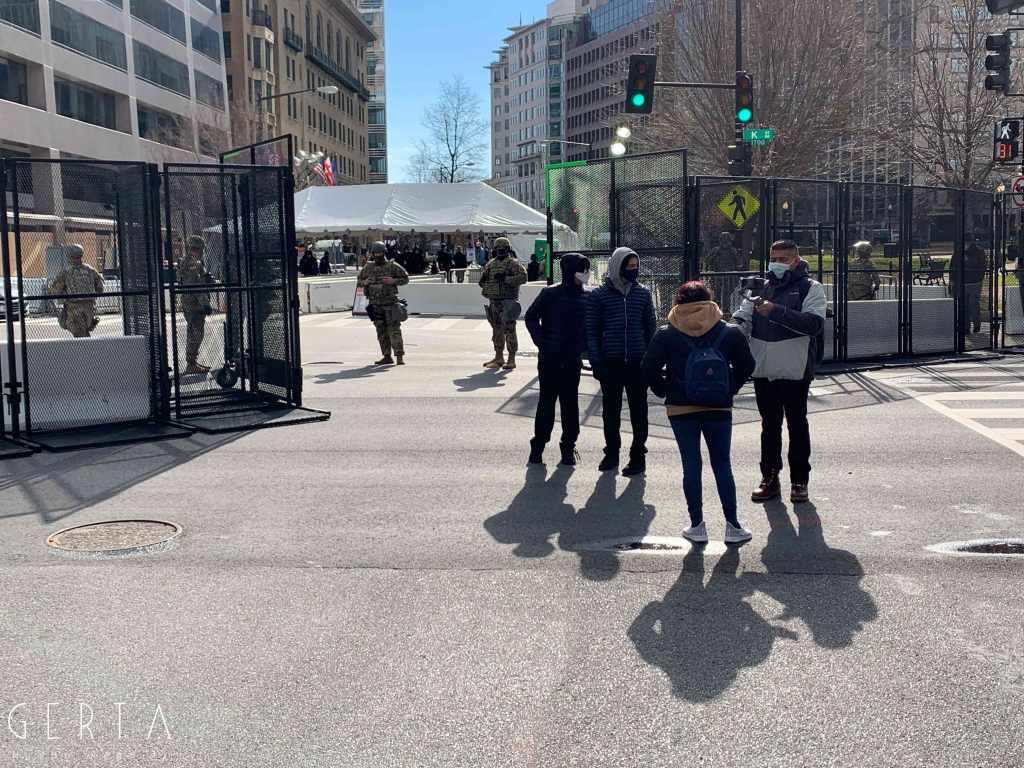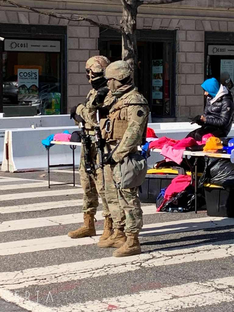 Washington ha dunque assunto un aspetto militarizzato, rovesciando drammaticamente l’immagine consueta dove i luoghi del potere – assai più che in Italia – sono solitamente aperti alle visite del pubblico e accessibili ai cittadini comuni. La città si è vuotata: cessate, anche a causa della pandemia, le visite dei turisti che vengono da lontano, persino le persone che vivono a pochi chilometri di distanza in questi giorni hanno evitato di recarsi nella capitale. Per quello che si può intuire, anche i residenti che potevano essere ospitati al di fuori della zona recitata, hanno preferito lasciare per qualche giorno le loro case. La massiccia presenza di truppe e mezzi miliari, delle macchine della polizia, dei posti di blocco in una città completamente deserta, trasmette l’immagine di uno stato di assedio, come se il temuto colpo di Stato fosse effettivamente avvenuto. Forse anche per questo, chiaramente eseguendo ordini precisi, i soldati si dimostravano molto cordiali con i pochissimi visitatori che per curiosità si avvicinavano alle recinzioni, cercando di trasmettere un’irreale sensazione di “normalità”, in uno scenario che niente aveva di normale.