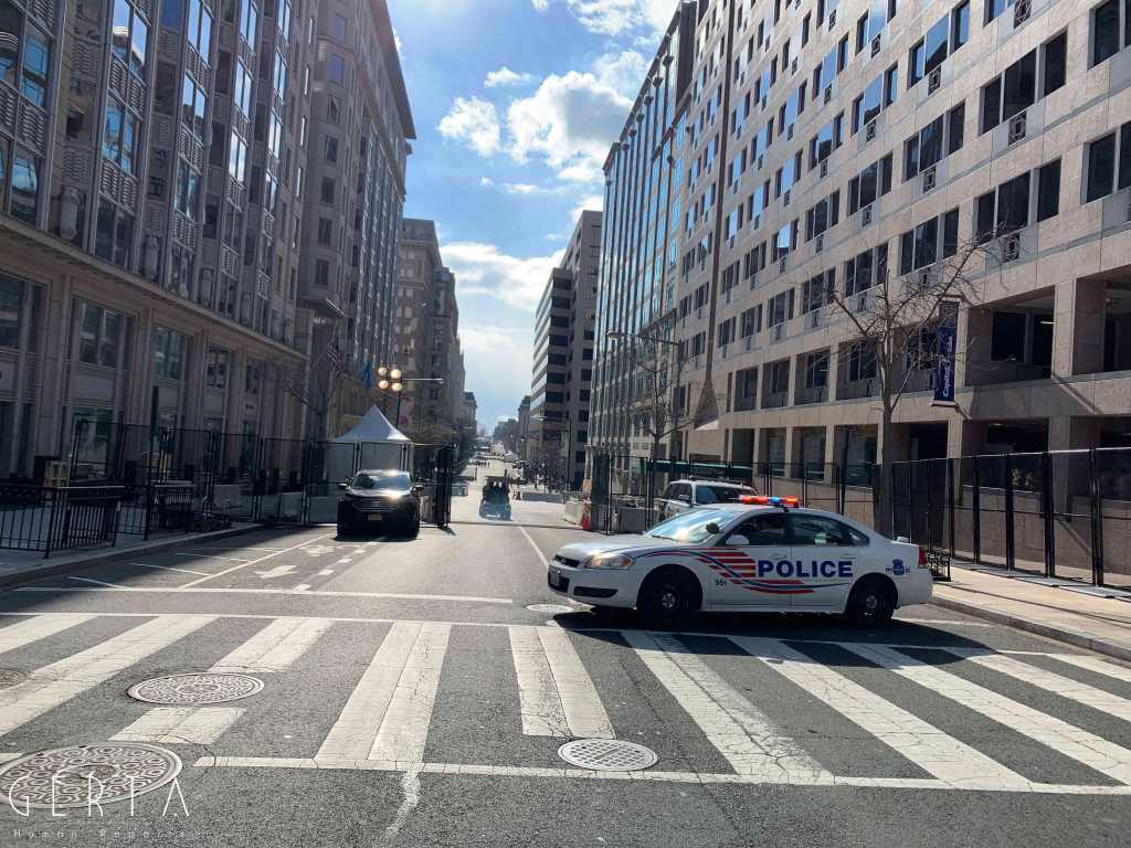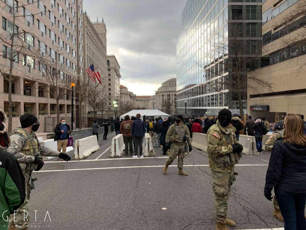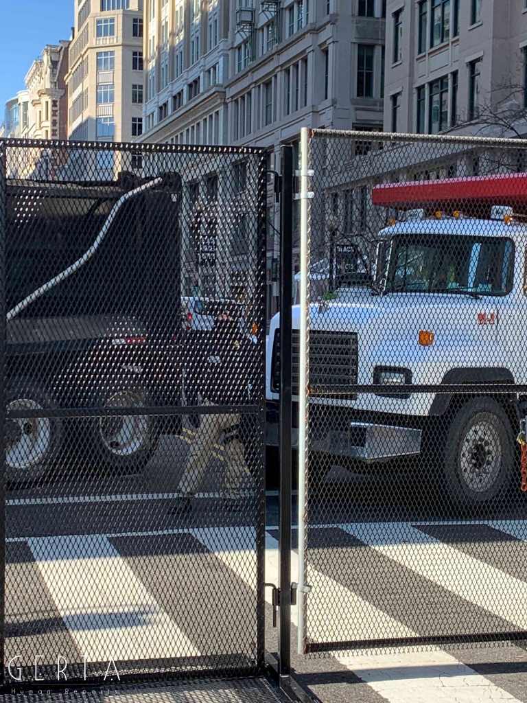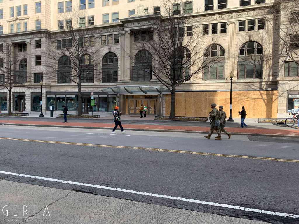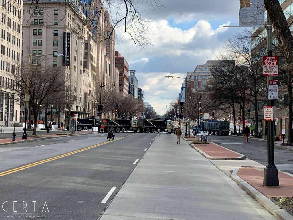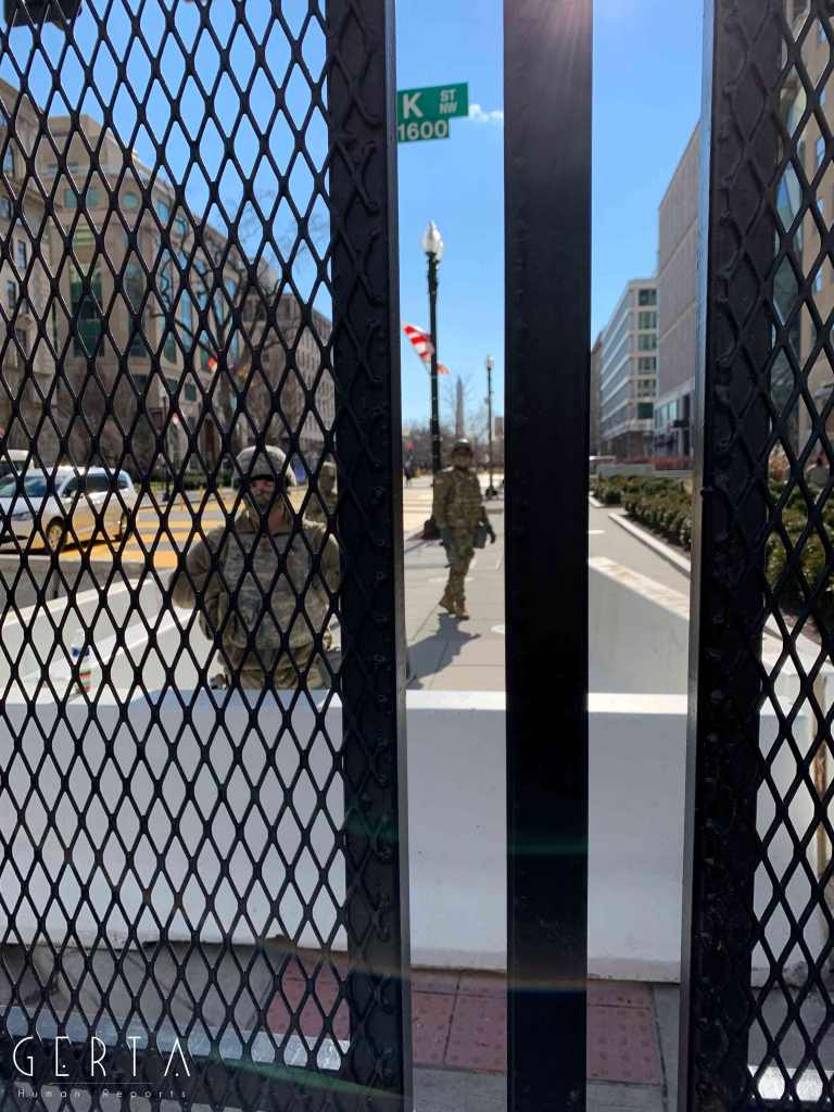 Washington ha dunque assunto un aspetto militarizzato, rovesciando drammaticamente l’immagine consueta dove i luoghi del potere – assai più che in Italia – sono solitamente aperti alle visite del pubblico e accessibili ai cittadini comuni. La città si è vuotata: cessate, anche a causa della pandemia, le visite dei turisti che vengono da lontano, persino le persone che vivono a pochi chilometri di distanza in questi giorni hanno evitato di recarsi nella capitale. Per quello che si può intuire, anche i residenti che potevano essere ospitati al di fuori della zona recitata, hanno preferito lasciare per qualche giorno le loro case. La massiccia presenza di truppe e mezzi miliari, delle macchine della polizia, dei posti di blocco in una città completamente deserta, trasmette l’immagine di uno stato di assedio, come se il temuto colpo di Stato fosse effettivamente avvenuto. Forse anche per questo, chiaramente eseguendo ordini precisi, i soldati si dimostravano molto cordiali con i pochissimi visitatori che per curiosità si avvicinavano alle recinzioni, cercando di trasmettere un’irreale sensazione di “normalità”, in uno scenario che niente aveva di normale.