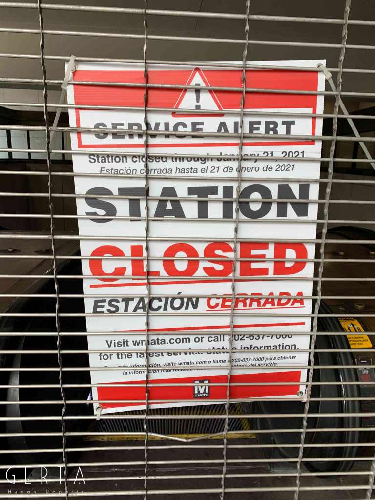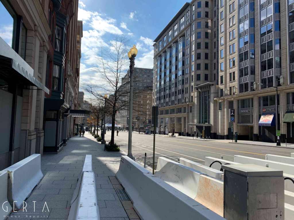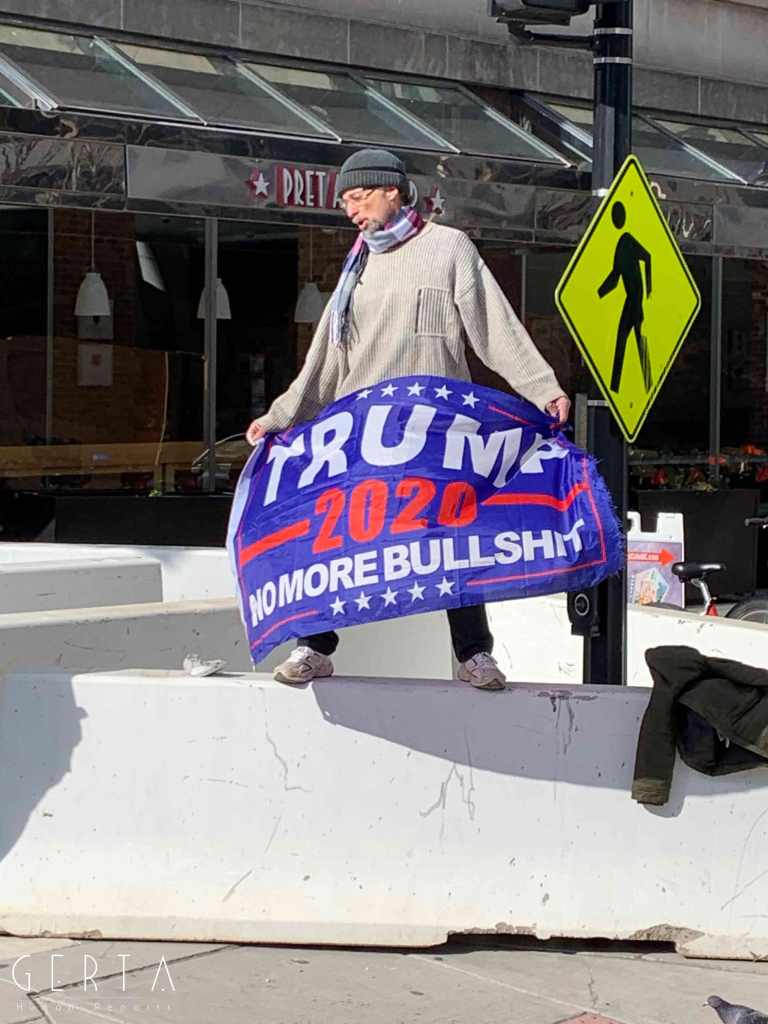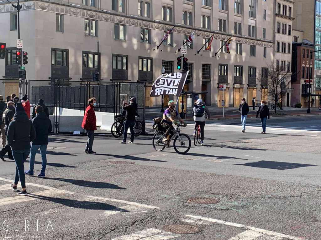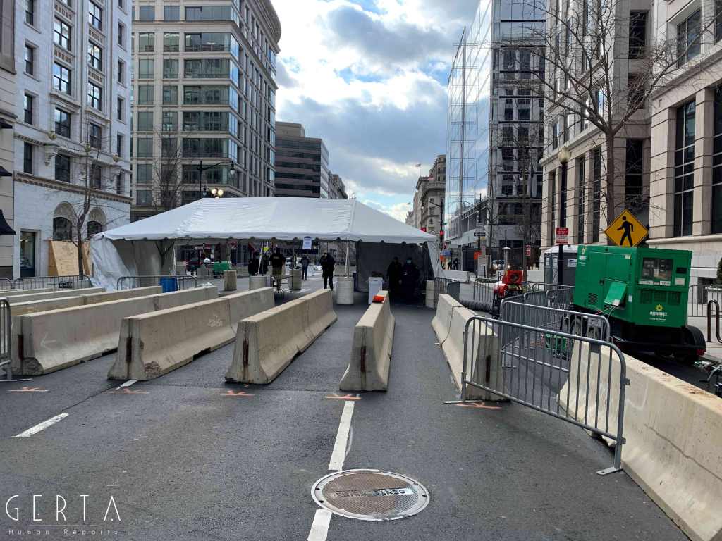 Washington ha dunque assunto un aspetto militarizzato, rovesciando drammaticamente l’immagine consueta dove i luoghi del potere – assai più che in Italia – sono solitamente aperti alle visite del pubblico e accessibili ai cittadini comuni. La città si è vuotata: cessate, anche a causa della pandemia, le visite dei turisti che vengono da lontano, persino le persone che vivono a pochi chilometri di distanza in questi giorni hanno evitato di recarsi nella capitale. Per quello che si può intuire, anche i residenti che potevano essere ospitati al di fuori della zona recitata, hanno preferito lasciare per qualche giorno le loro case. La massiccia presenza di truppe e mezzi miliari, delle macchine della polizia, dei posti di blocco in una città completamente deserta, trasmette l’immagine di uno stato di assedio, come se il temuto colpo di Stato fosse effettivamente avvenuto. Forse anche per questo, chiaramente eseguendo ordini precisi, i soldati si dimostravano molto cordiali con i pochissimi visitatori che per curiosità si avvicinavano alle recinzioni, cercando di trasmettere un’irreale sensazione di “normalità”, in uno scenario che niente aveva di normale.