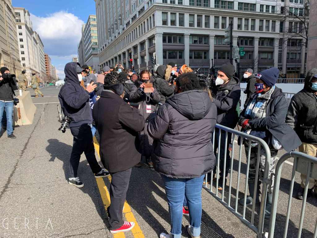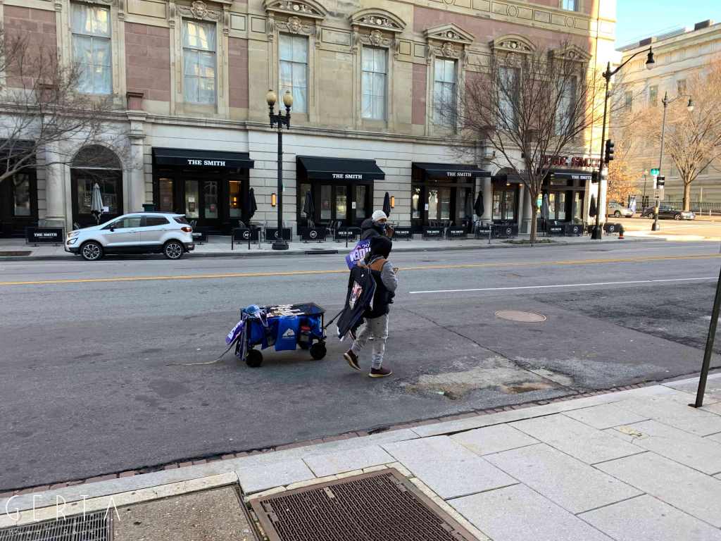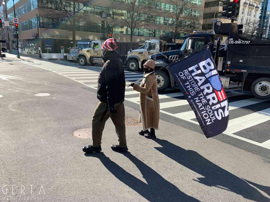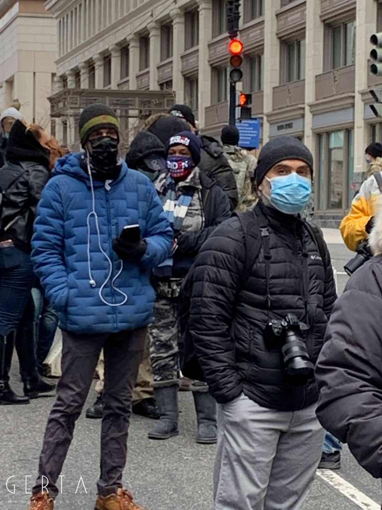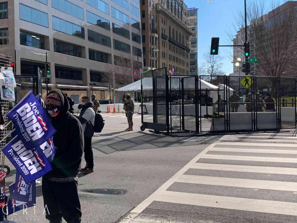 Il giorno dell’inaugurazione l’accesso è stato reso ancora più difficile, chiudendo anche molti dei ponti che permettono di raggiungere Washington dalla Virginia. La cerimonia, aperta solo a un ristretto numero di invitati, si poteva seguire alla tv e online ma la città era completamente deserta, proprio come nei giorni passati, trasformando di fatto l’inaugurazione in un evento virtuale. Solo poche decine di persone si sono avventurate per le strade che circondano la zona recintata (c’erano senz’altro più giornalisti che persone comuni). Pochissimi e malinconici erano i banchetti dove si potevano comprare magliette e spillini in onore di Joe Biden e Kamala Harris, anche se, rispetto ai giorni precedenti si poteva avvertire un clima meno teso e preoccupato, anche grazie a una splendida giornata di sole, nonostante il freddo e qualche fiocco di neve che è caduto a metà mattina.