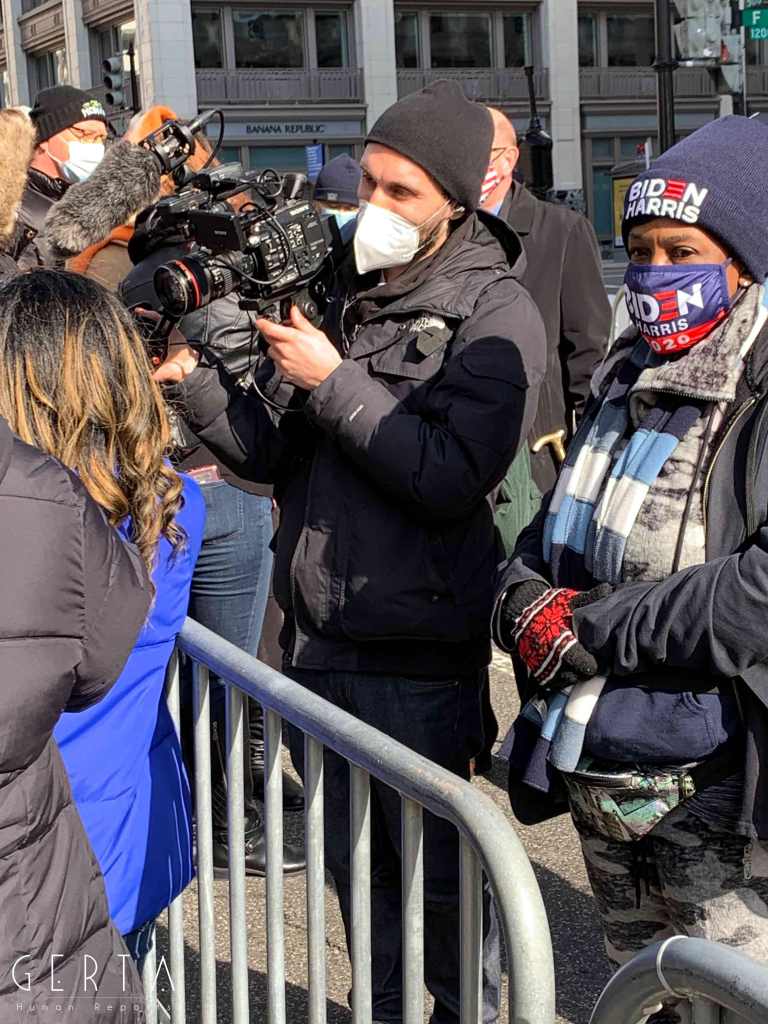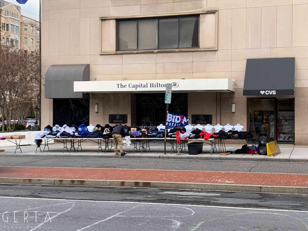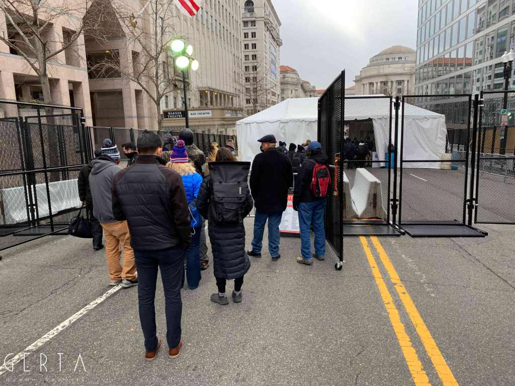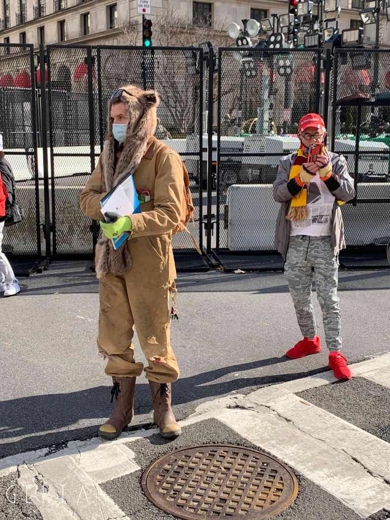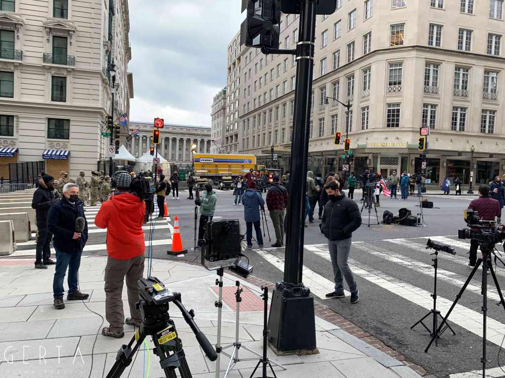 Il giorno dell’inaugurazione l’accesso è stato reso ancora più difficile, chiudendo anche molti dei ponti che permettono di raggiungere Washington dalla Virginia. La cerimonia, aperta solo a un ristretto numero di invitati, si poteva seguire alla tv e online ma la città era completamente deserta, proprio come nei giorni passati, trasformando di fatto l’inaugurazione in un evento virtuale. Solo poche decine di persone si sono avventurate per le strade che circondano la zona recintata (c’erano senz’altro più giornalisti che persone comuni). Pochissimi e malinconici erano i banchetti dove si potevano comprare magliette e spillini in onore di Joe Biden e Kamala Harris, anche se, rispetto ai giorni precedenti si poteva avvertire un clima meno teso e preoccupato, anche grazie a una splendida giornata di sole, nonostante il freddo e qualche fiocco di neve che è caduto a metà mattina.