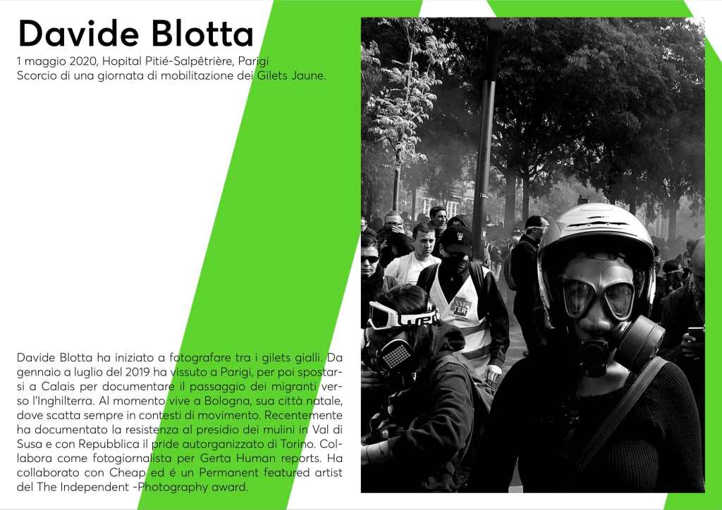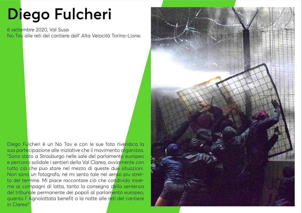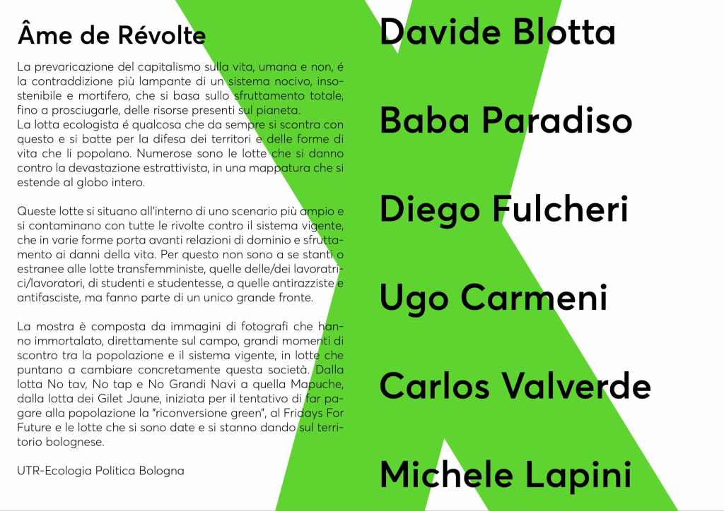 La mostra è composta da immagini di fotografi che hanno immortalato, direttamente sul campo, grandi momenti di scontro tra la popolazione e il sistema vigente, in lotte che puntano a cambiare concretamente questa società. Dalla lotta No tav, No tap e No Grandi Navi a quella Mapuche, dalla lotta dei Gilet Jaune, iniziata per il tentativo di far pagare alla popolazione la “riconversione green”, al Fridays For Future e le lotte che si sono date e si stanno dando sul territorio bolognese.