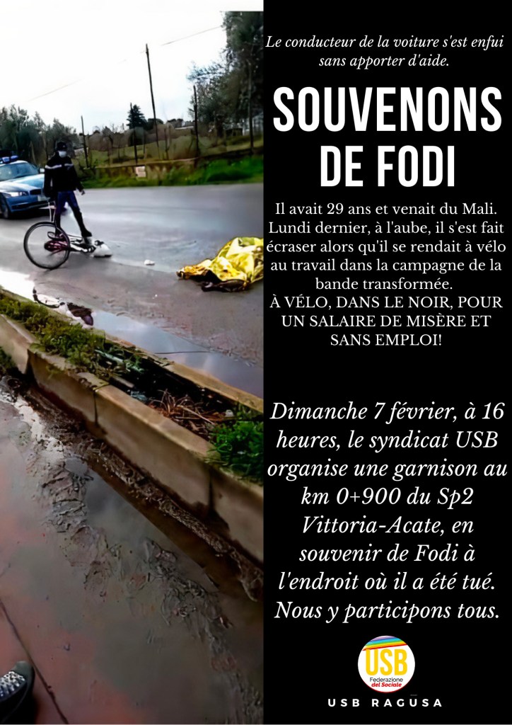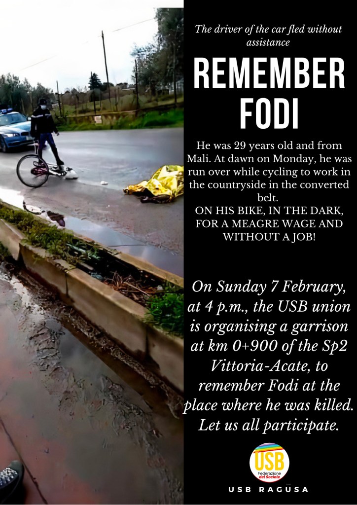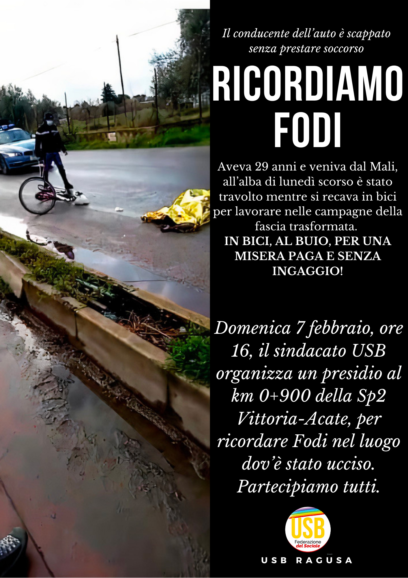 Fodi, ragazzo maliano di 29 anni, pieno di vita e di speranza, è l’ennesima vittima di una tragedia annunciata: un territorio, la fascia trasformata ragusana, in cui sfruttamento e caporalato strangolano i diritti e le vite di tantissimi braccianti agricoli (soprattutto donne e stranieri).