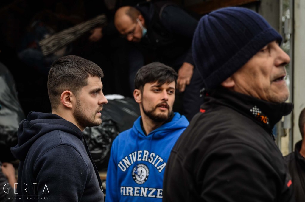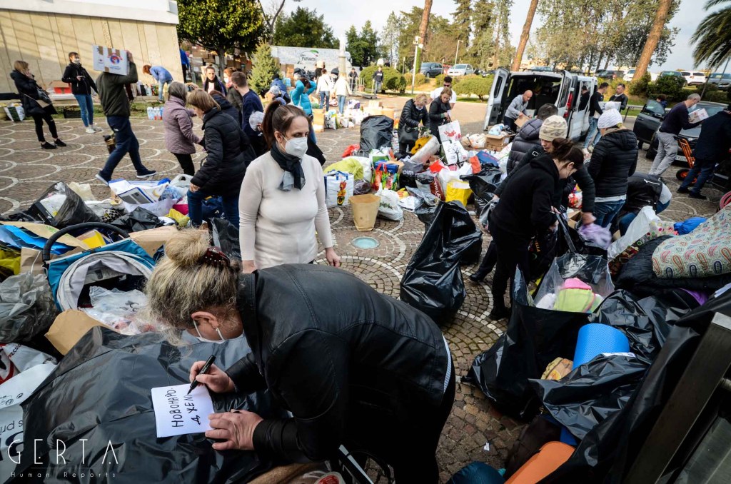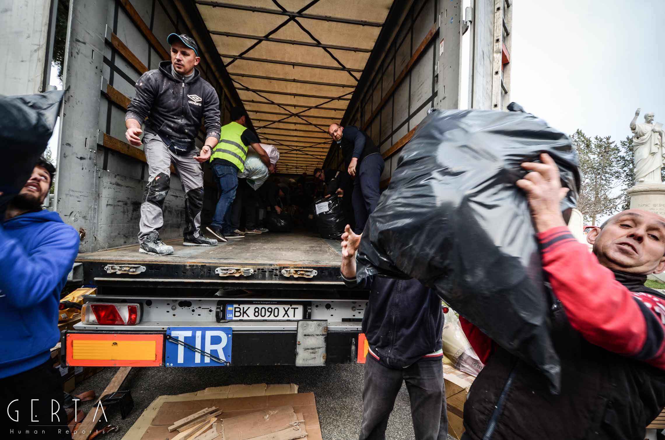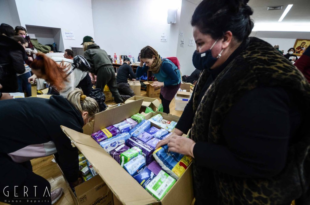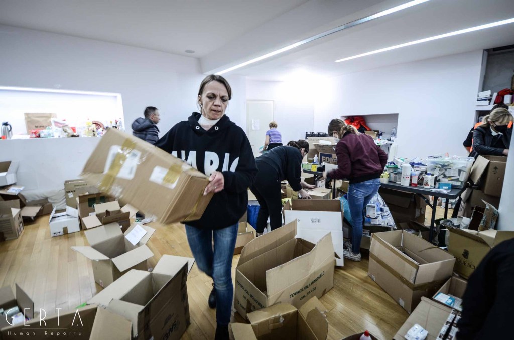 Gli Ucraini corrono e lavorano incessantemente, le donne dividono, impacchettano, riempiono dei sacchi neri con indumenti e tutto quello che può servire, comprese barelle, lenzuola, respiratori. Gli uomini caricano questi enormi TIR senza mai fermarsi.