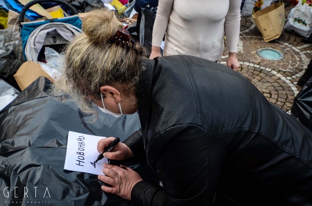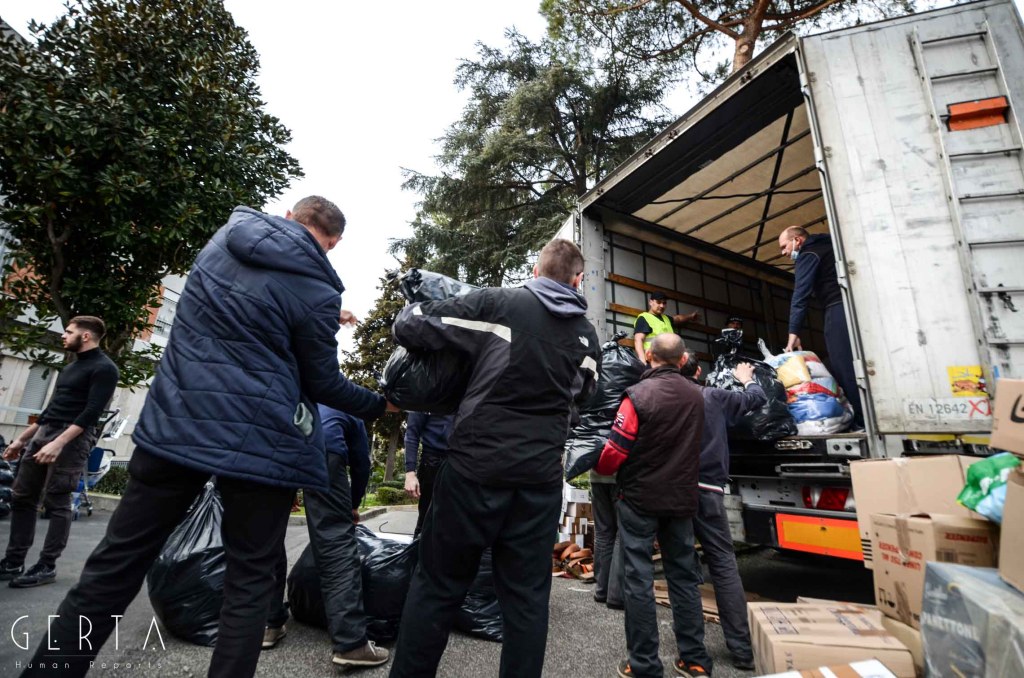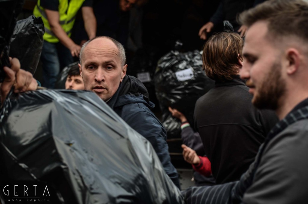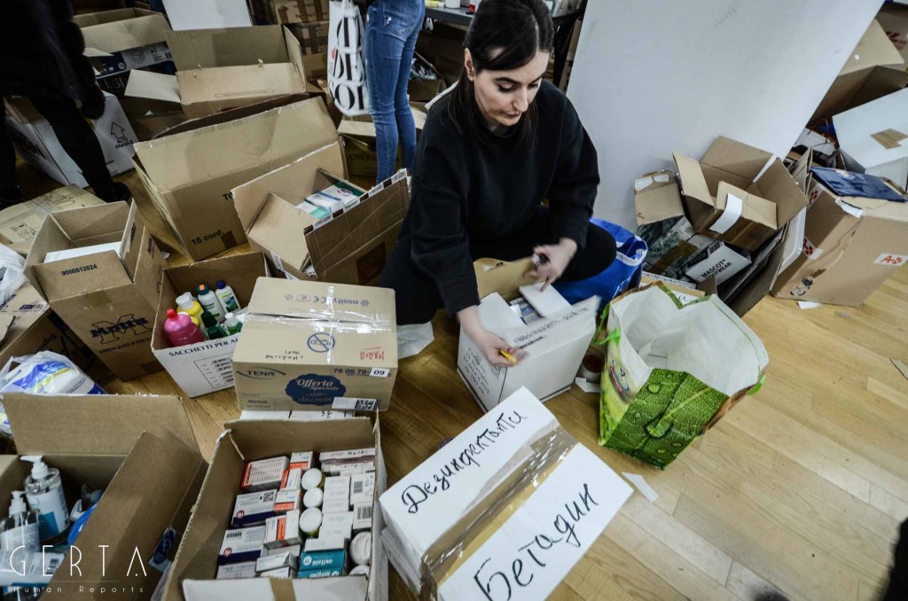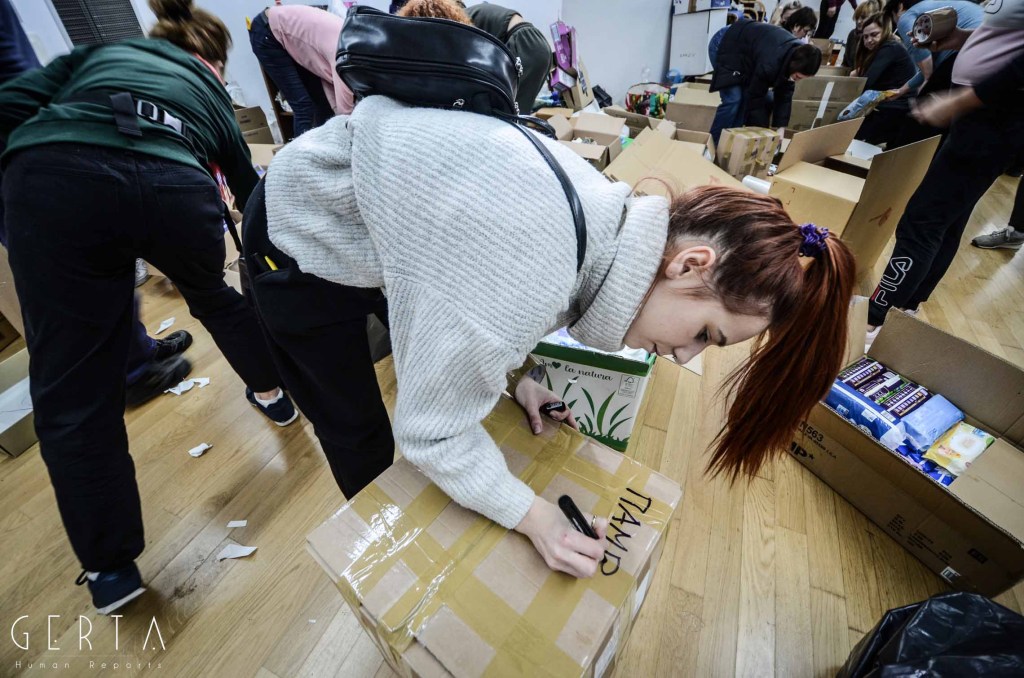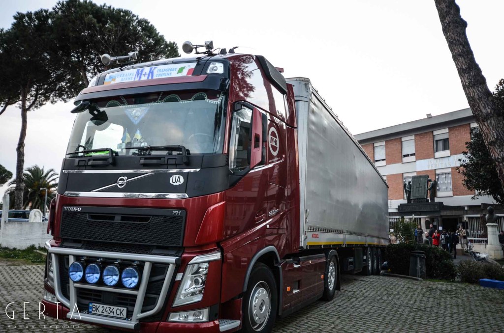 Gli Ucraini corrono e lavorano incessantemente, le donne dividono, impacchettano, riempiono dei sacchi neri con indumenti e tutto quello che può servire, comprese barelle, lenzuola, respiratori. Gli uomini caricano questi enormi TIR senza mai fermarsi.